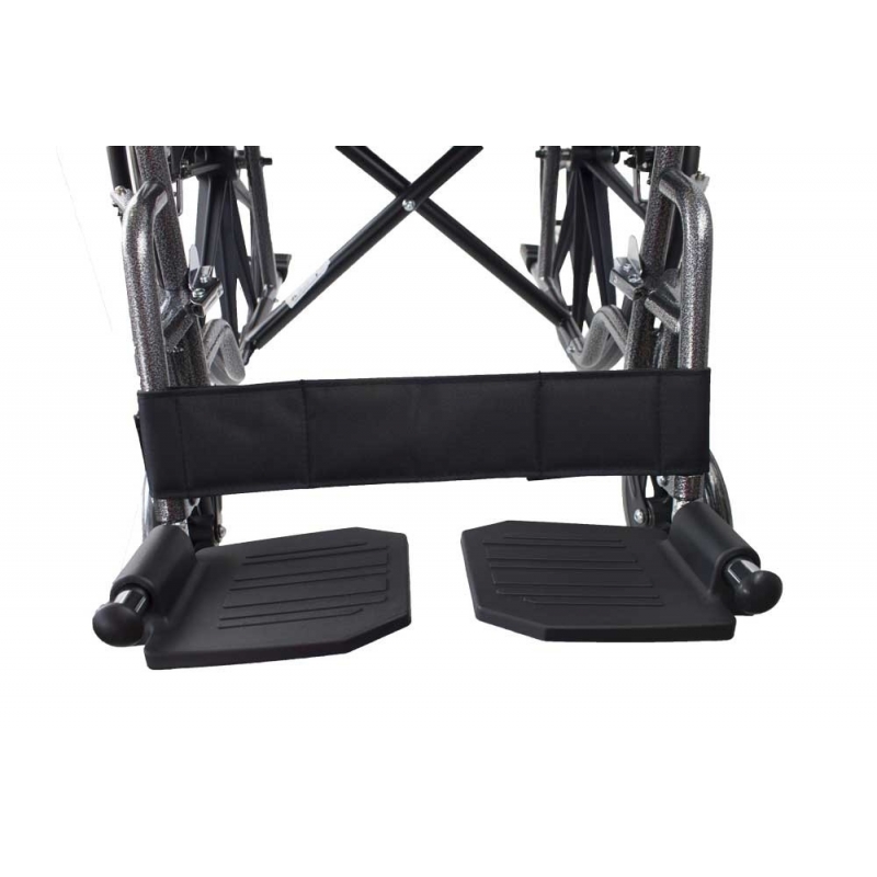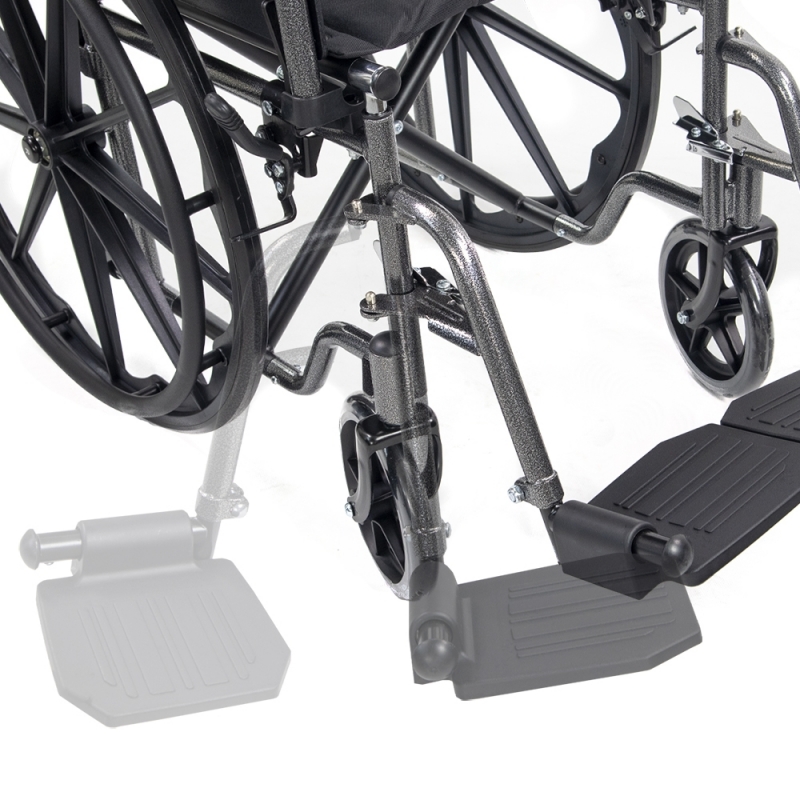 EINFACH ZU VERWENDEN: Die Fußstützen des Rollstuhls lassen sich leicht abnehmen und sind höhenverstellbar, um sich der Körpergröße des Nutzers anzupassen.