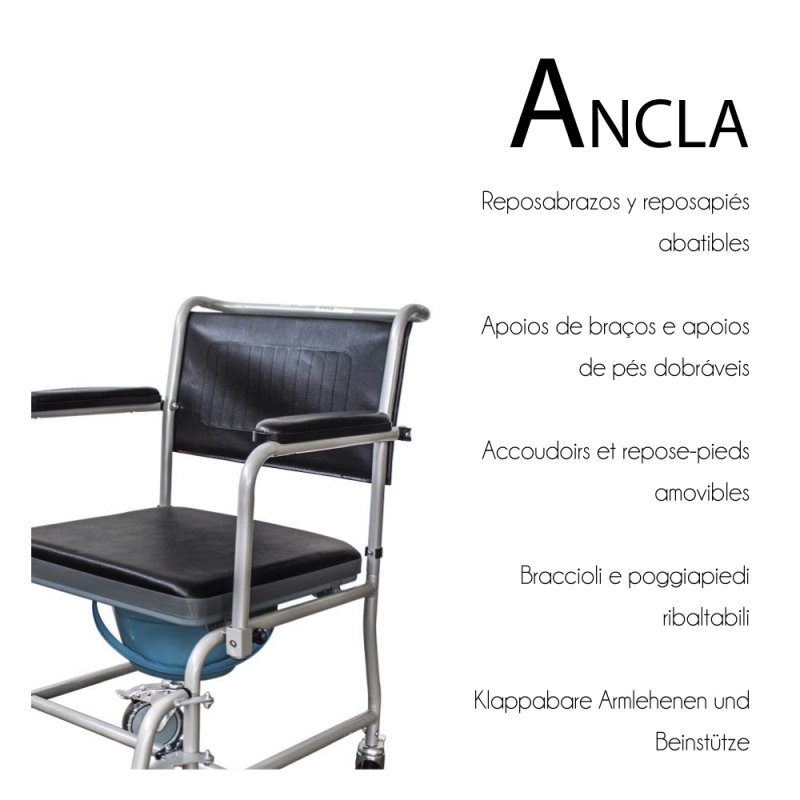 Der Ancla Toilettenstuhl mit Rädern ist eine ideale Badehilfe für Menschen mit Mobilitätseinschränkung oder wenn sie Schwierigkeiten haben, sauber zu werden oder ihre Bedürfnisse zu erfüllen. Dieser Badestuhl ist wirklich praktisch und sehr bequem, um sich im Haus zu bewegen.