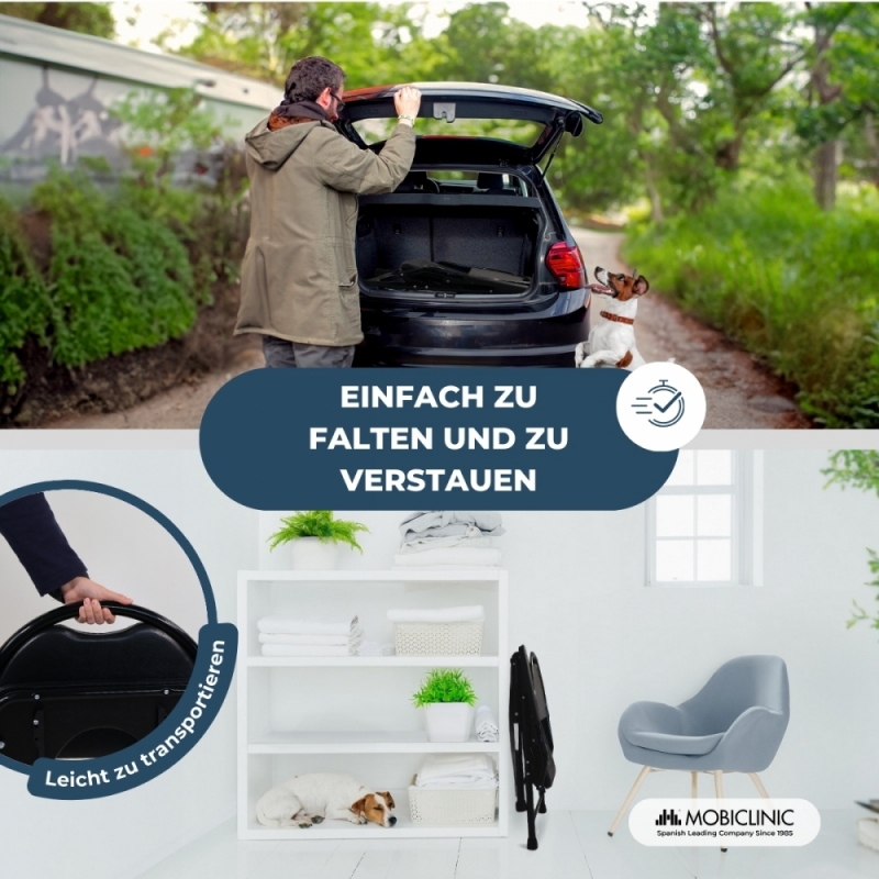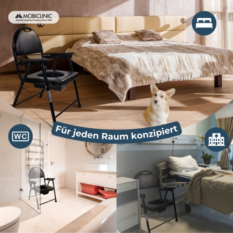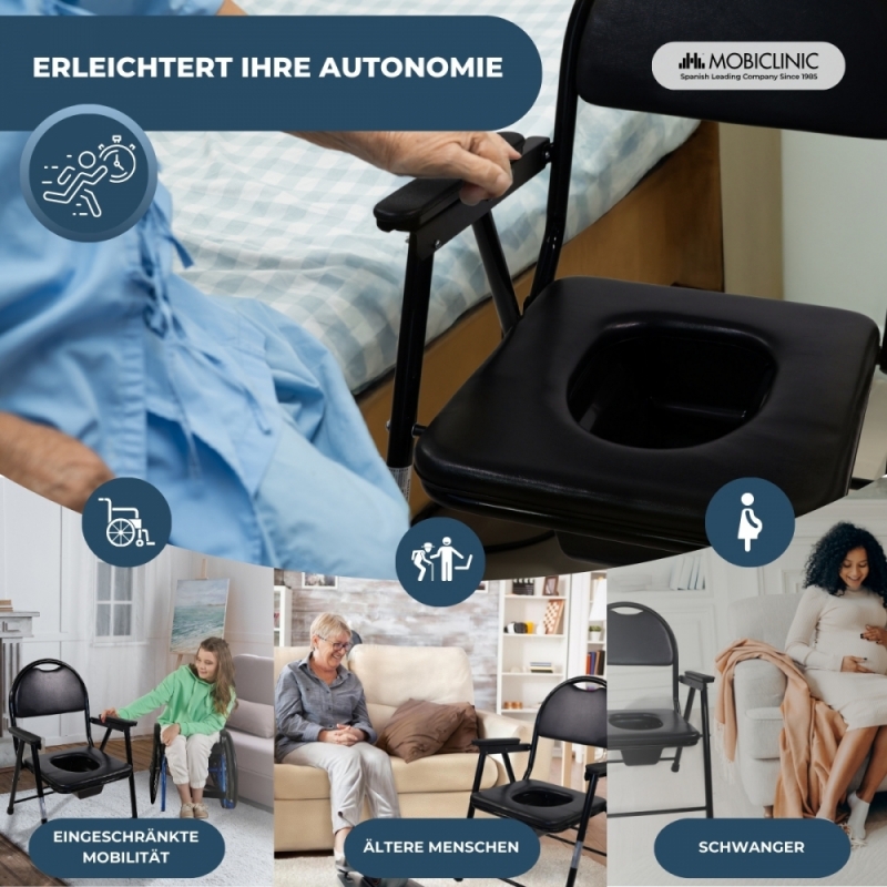 Dieser Toilettensitz ist sehr bequem, denn er ist faltbar und kann bei Bedarf in der Nähe des Patienten platziert und bei Nichtgebrauch wieder zusammengeklappt werden, um ihn zu verstauen. Dank dieser Eigenschaft können Sie, sollten Sie einen WC Stuhl kaufen, diesen leicht von einem Ort zum anderen transportieren, ohne viel Platz zu beanspruchen, so dass er sich für alle möglichen Orte eignet.