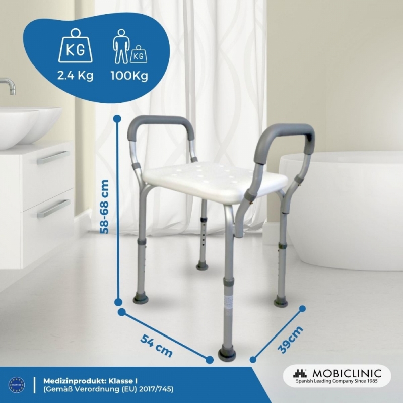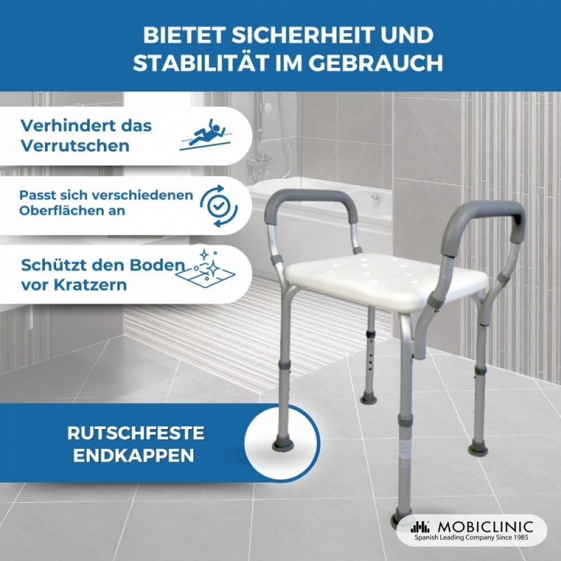 Dieses Modell des Duschhockers mit Armlehnen zeichnet sich durch seinen Preis und seine hohe Qualität aus. Er ist aus Aluminium und Thermoplast hergestellt, was ihn leichter und mobiler macht. Er hat vier höhenverstellbare Beine mit rutschfesten Polstern, die es ihm ermöglichen, sich an jede Art von Badezimmer anzupassen, wodurch er sicher zu bedienen ist. Auf der anderen Seite hat dieser Duschhocker für Dusche und Badewanne Entwässerungslöcher im Sitz, die den Wasserabfluss ermöglichen.