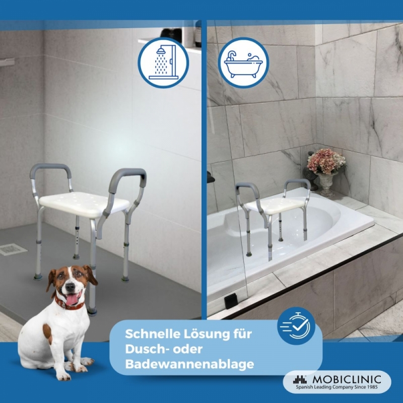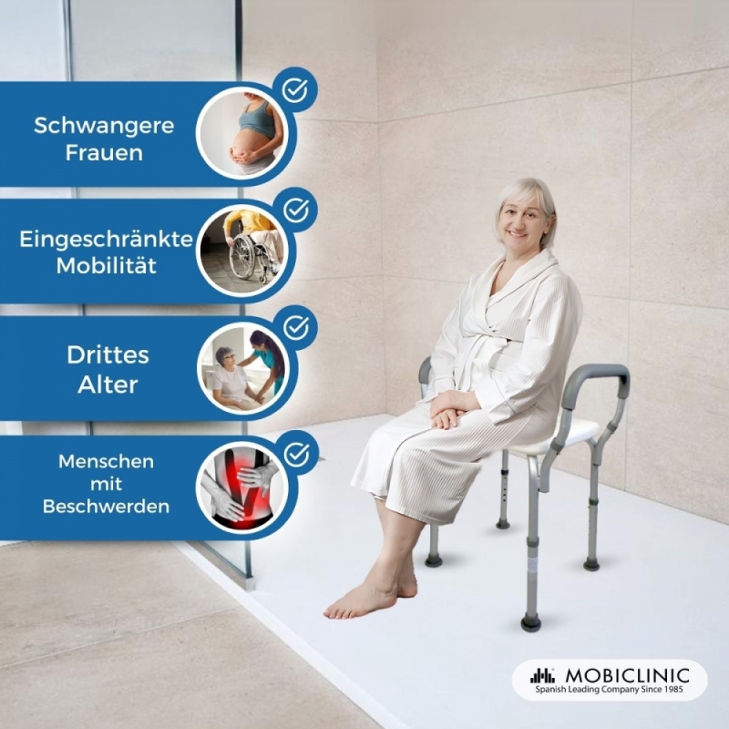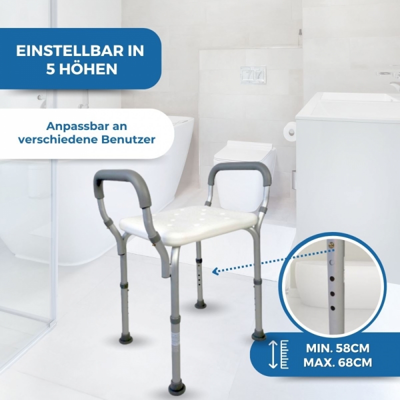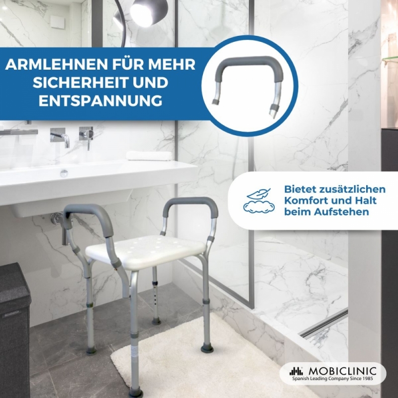 Darüber hinaus sind die Armlehnen des Badestuhls für den Komfort des Benutzers gefüttert und sehr einfach zu montieren. Mit nur einem Klick können Sie sie ganz einfach an- und ablegen.