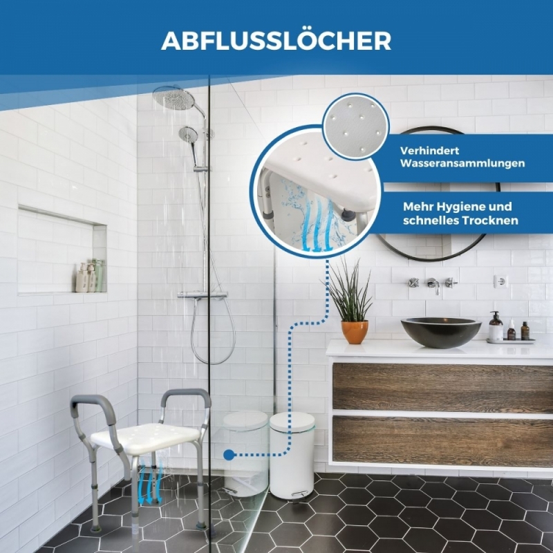 - Gewicht: Dank seiner Materialien wiegt der orthopädische Duschstuhl nur 2,4 kg und eignet sich hervorragend, um ihn bequem in der Toilette zu transportieren.