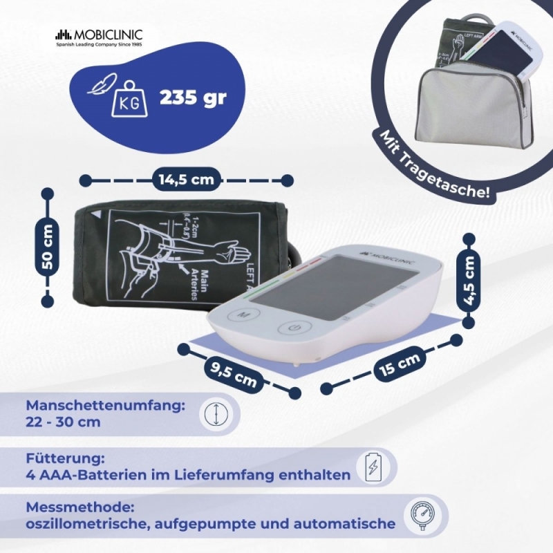 -Messmethode: Oszillometrische Methode, automatisches Aufblasen und Messen.