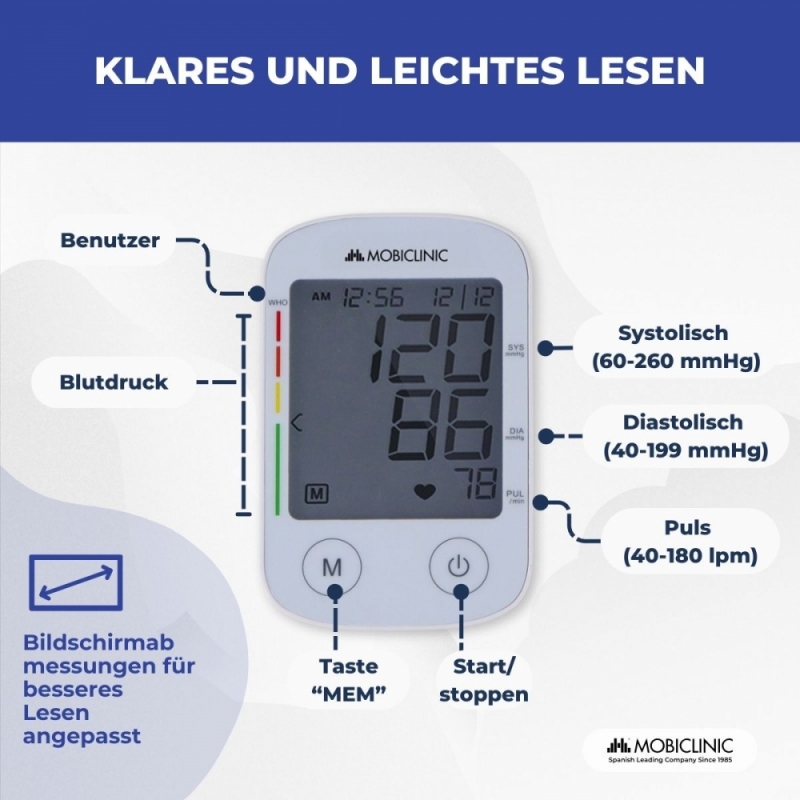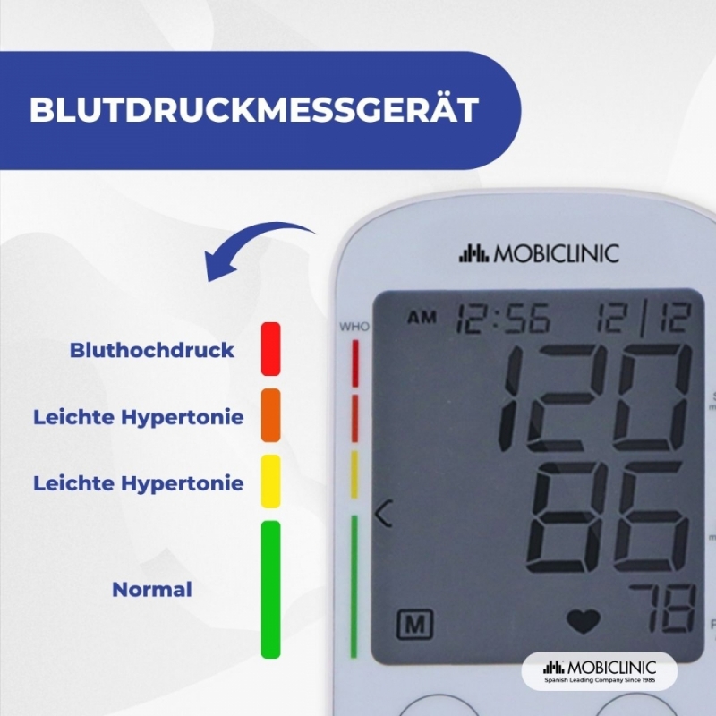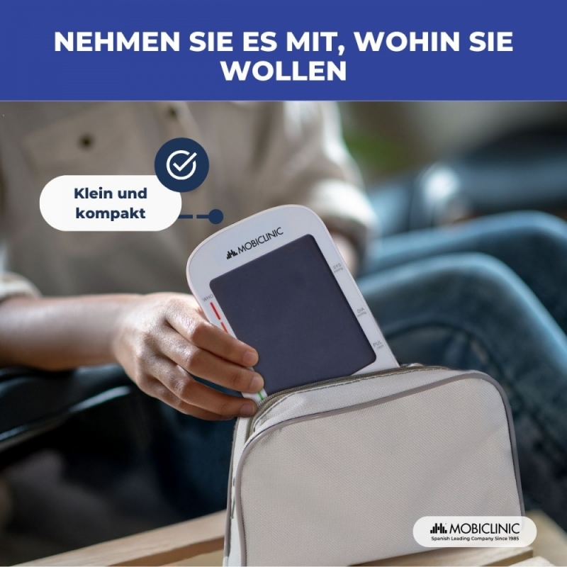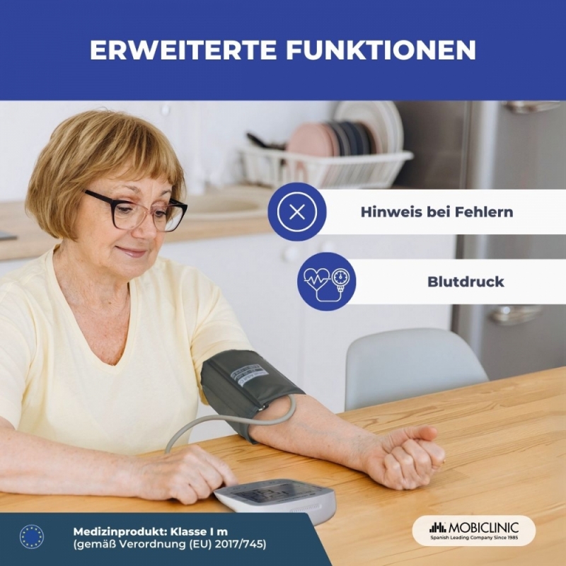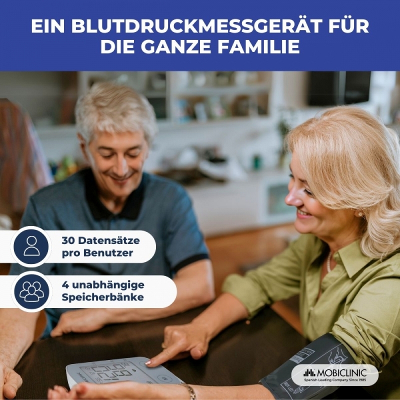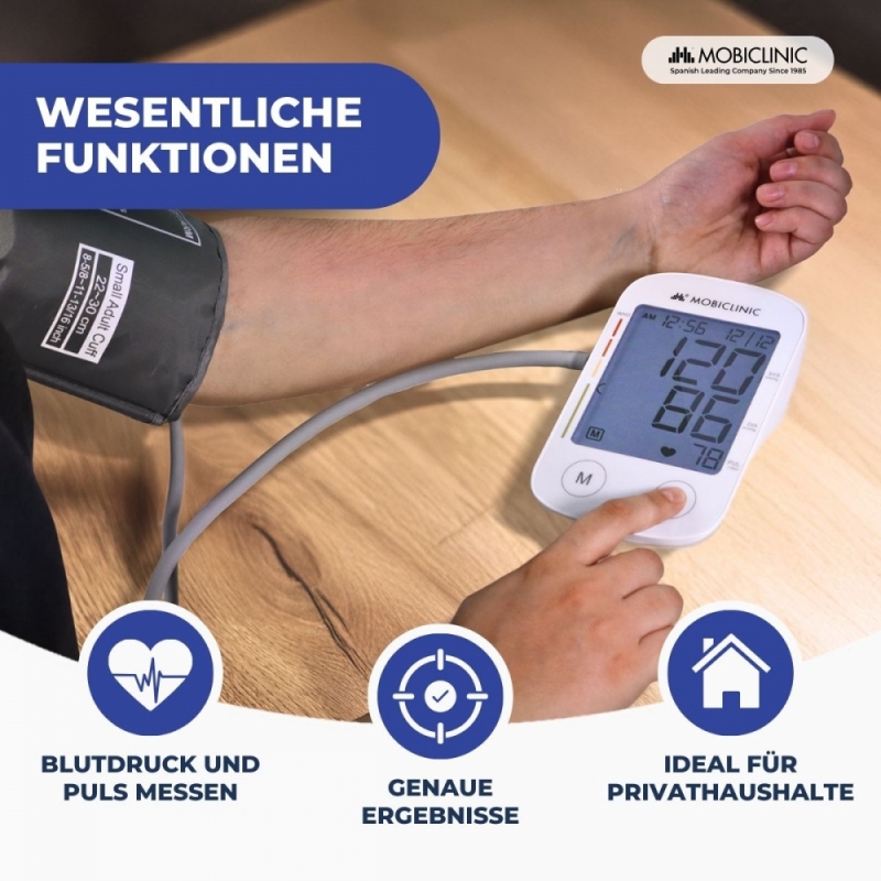 Das automatische Blutdruckmessgerät von Mobiclinic mit Messwertspeicher misst Blutdruck und Puls schnell und einfach.