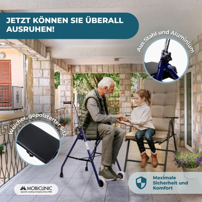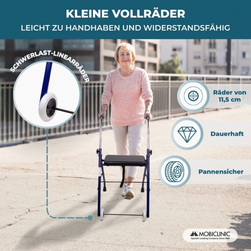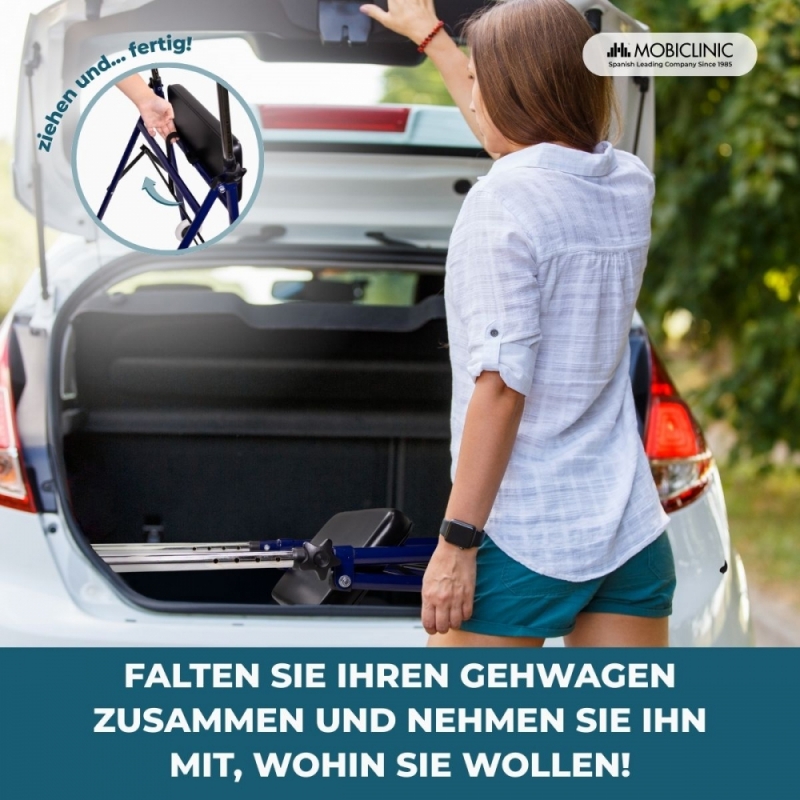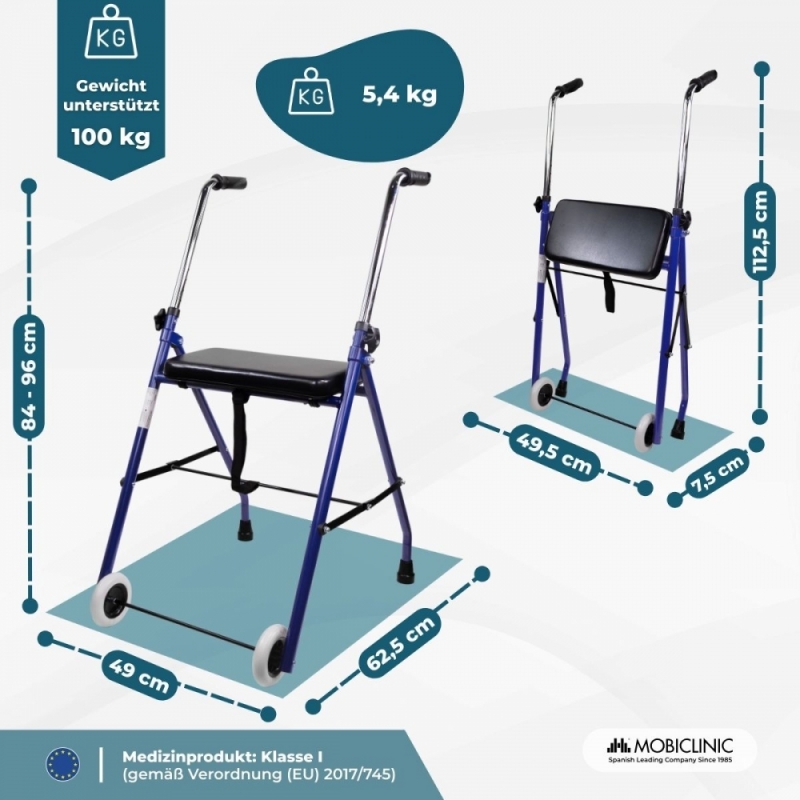 Da es sich um einen faltbaren Rollator handelt, lässt er sich dank seiner Mittelachse leicht zusammenklappen. Sein leuchtend blaues Design verleiht diesem Rollator für Senioren die Eleganz, die sie sich immer gewünscht haben.