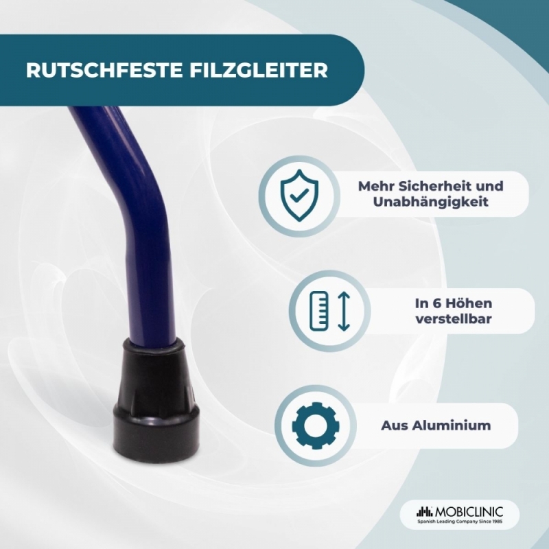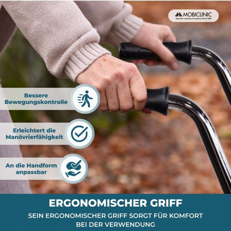 Der Rollator Emérita von Mobiclinic verfügt über zwei Räder, die Ihnen die nötige Stabilität beim Gehen bieten. Er hat außerdem einen gepolsterten PVC-Sitz, auf dem Sie sich jederzeit ausruhen können. Die ergonomischen Griffe sind höhenverstellbar von 84,2 cm bis 96 cm und lassen sich so optimal an Ihre Bedürfnisse anpassen.