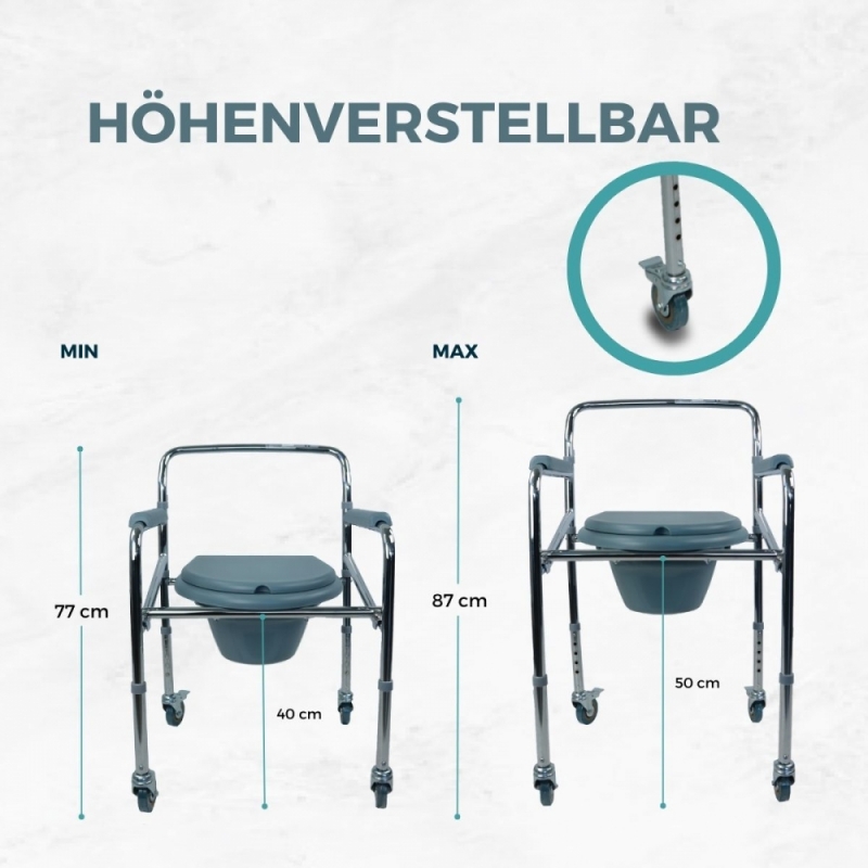 Seine robusten und widerstandsfähigen Räder aus thermoplastischem Gummi haben einen Durchmesser von 7,62 cm und machen es Ihnen leicht, den Toilettenstuhl für Patienten von einem Raum zum anderen zu bewegen. Zwei der Räder verfügen über eine Tretbremse, um die Behindertentoilette während der Benutzung zu stabilisieren. Außerdem ist er höhenverstellbar.