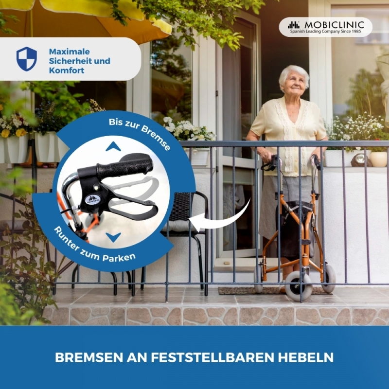 Das Gehgestell ist höhenverstellbar, um sich den Bedürfnissen jedes Benutzers anzupassen. Dieser Gehwagen für Senioren hat ergonomische Handgriffen für mehr Komfort, die helfen, das Gewicht zu verteilen, um den Gehwagen auf sichere und natürliche Weise zu bremsen oder zu blockieren.