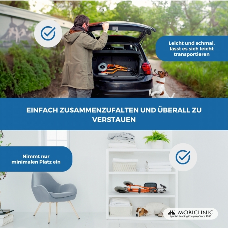 Diese klappbare Gehhilfe ist leicht zu transportieren und zu verstauen. Im gefalteten Zustand ist sie nur 25 cm breit.