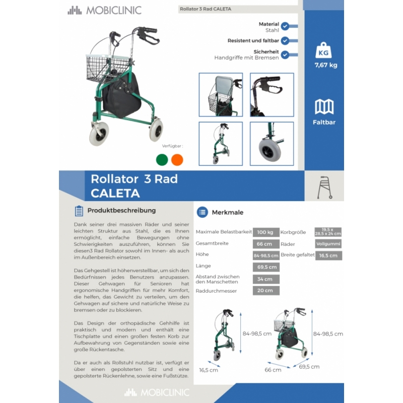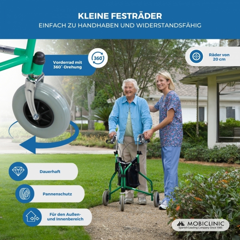 Dank seiner drei massiven Räder und seiner leichten Struktur aus Stahl, die es Ihnen ermöglicht, einfache Bewegungen ohne Schwierigkeiten auszuführen, können Sie diesen3 Rad Rollator sowohl im Innen- als auch im Außenbereich einsetzen.