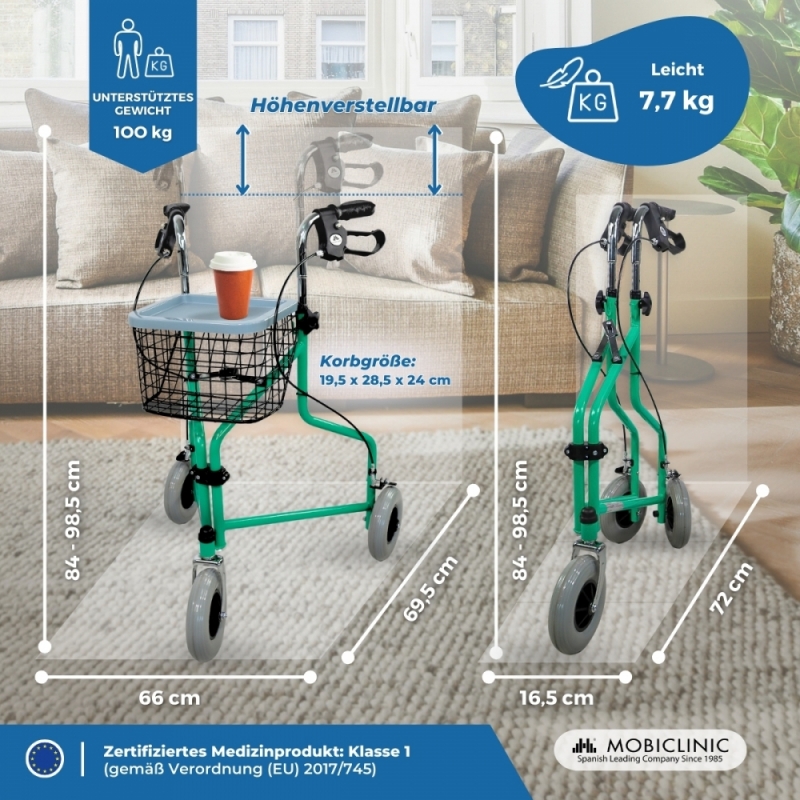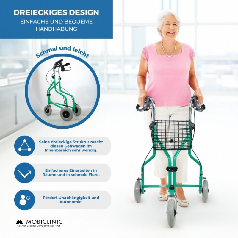 Dieser Rollator für Senioren mit drei Rädern ist geeignet für Menschen mit Mobilitätseinschränkung, die sich in der Behandlung oder während der Rehabilitation befinden, da sie ihnen die nötige Stabilität bei ihren Bewegungen und Spaziergängen gibt.