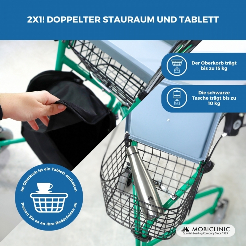 Das Design der orthopädische Gehhilfe ist praktisch und modern und enthält eine Tischplatte und einen großen festen Korb zur Aufbewahrung von Gegenständen sowie eine große Rückentasche.