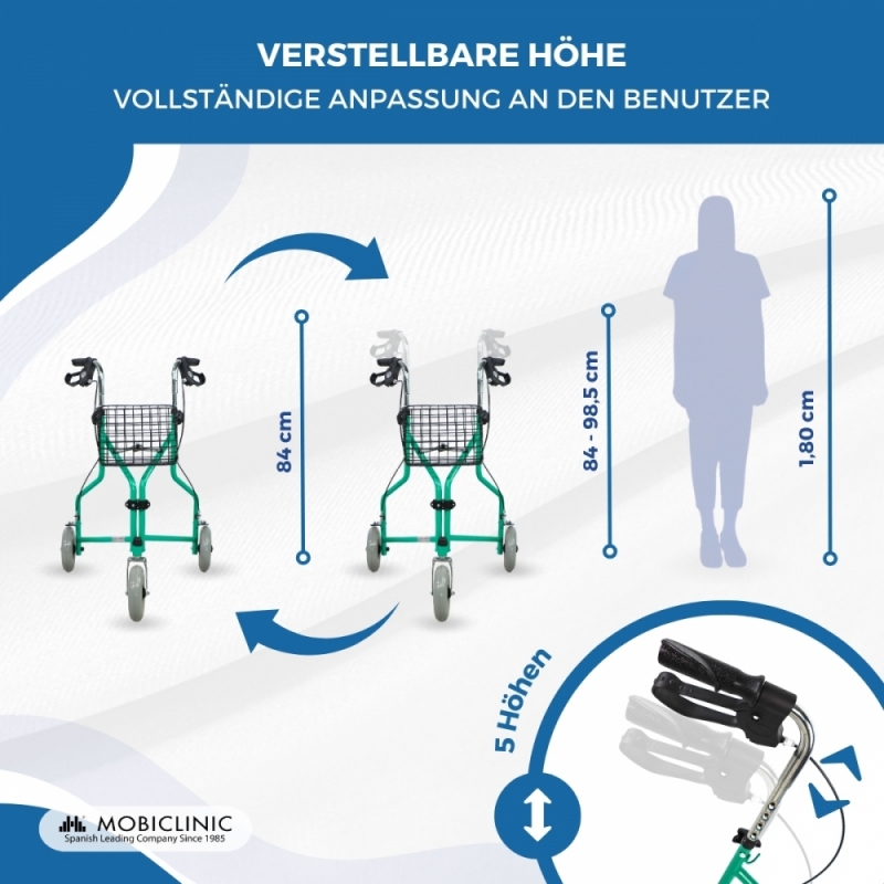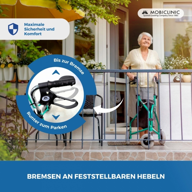 Das Gehgestell ist höhenverstellbar, um sich den Bedürfnissen jedes Benutzers anzupassen. Dieser Gehwagen für Senioren hat ergonomische Handgriffen für mehr Komfort, die helfen, das Gewicht zu verteilen, um den Gehwagen auf sichere und natürliche Weise zu bremsen oder zu blockieren.