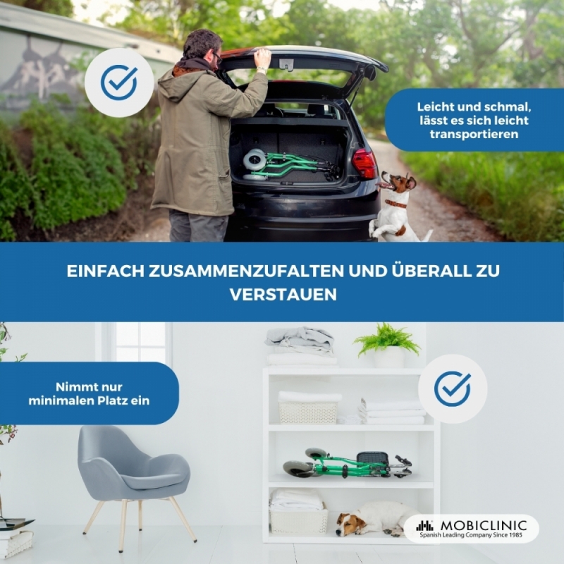 Diese klappbare Gehhilfe ist leicht zu transportieren und zu verstauen. Im gefalteten Zustand ist sie nur 25 cm breit.