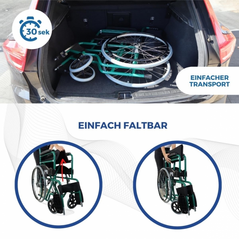 FALTBAR: Leicht zu verstauender faltbarer Rollstuhl . Lässt sich zum einfachen Transport zusammenklappen
