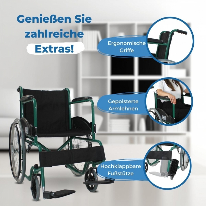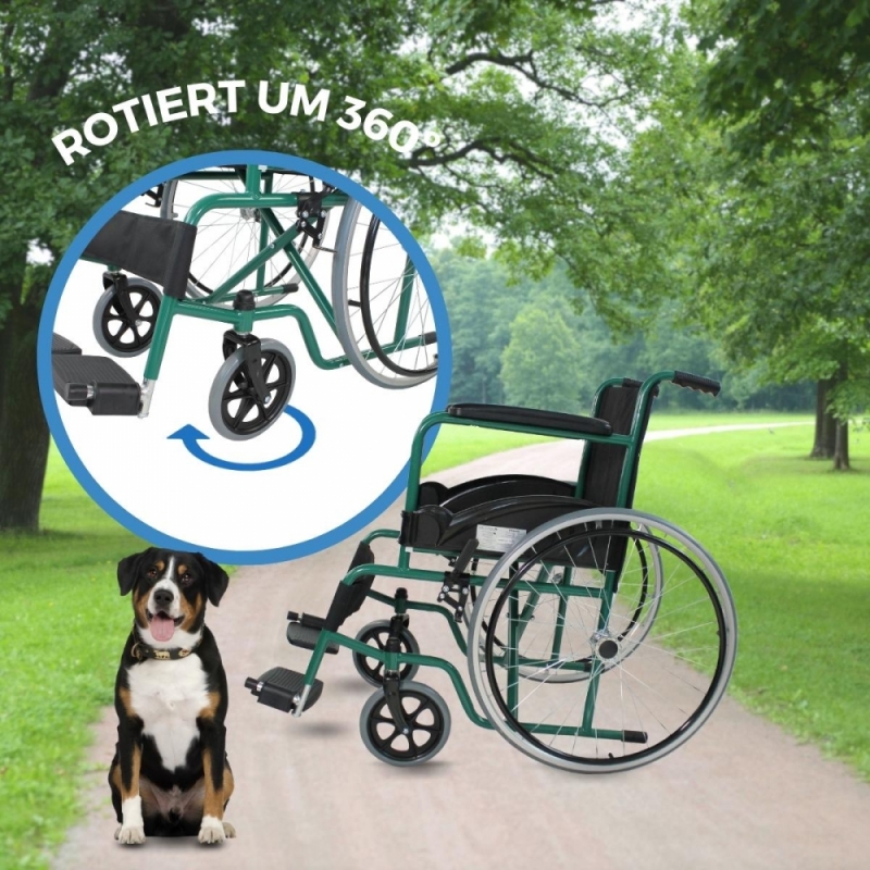 KOMFORTABEL: mit großen selbstfahrenden Rädern. Feste und bequeme Fußstütze und Armlehnen. Außerdem verfügt er über Bremsen an den Hinterrädern, was ihn zu einem sicheren Stuhl für ältere Menschen macht.