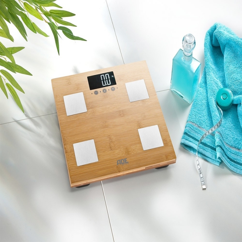 Dies ist eine robuste und nachhaltige elektronische Waage mit einer Wiegeplattform aus Bambus, die vom Forest Management Council zertifiziert wurde. Seine Oberfläche ist aus Bambusholz gefertigt.