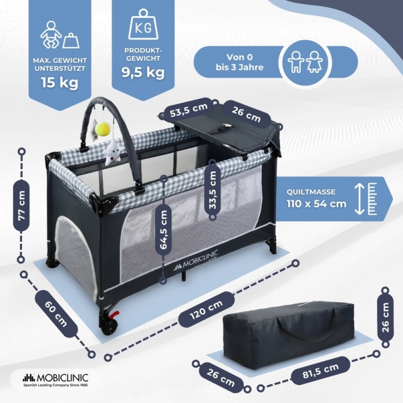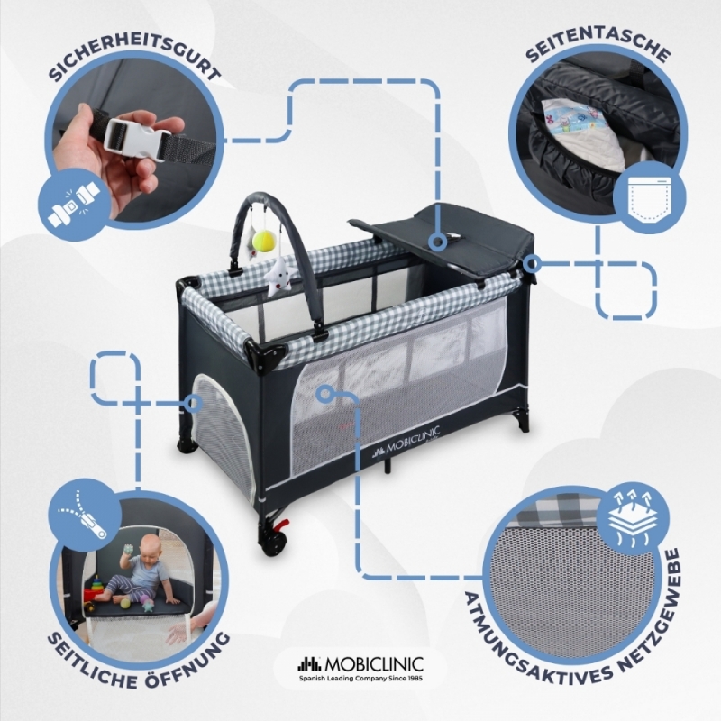 Die integrierte Wickelunterlage verfügt über einen Sicherheitsgurt und eine praktische Aufbewahrungstasche, um beim Windelwechseln die nötige Ordnung zu bewahren. Darüber hinaus verfügt es über einen Spielbogen, der die Entwicklung des Babys anregt und gleichzeitig Spaß macht. Das Kinderbett zeichnet sich außerdem dadurch aus, dass es leicht zusammenklappbar ist, was den Transport und die Lagerung erleichtert. Enthält eine Tragetasche, sodass Sie es bequem überall hin mitnehmen können.