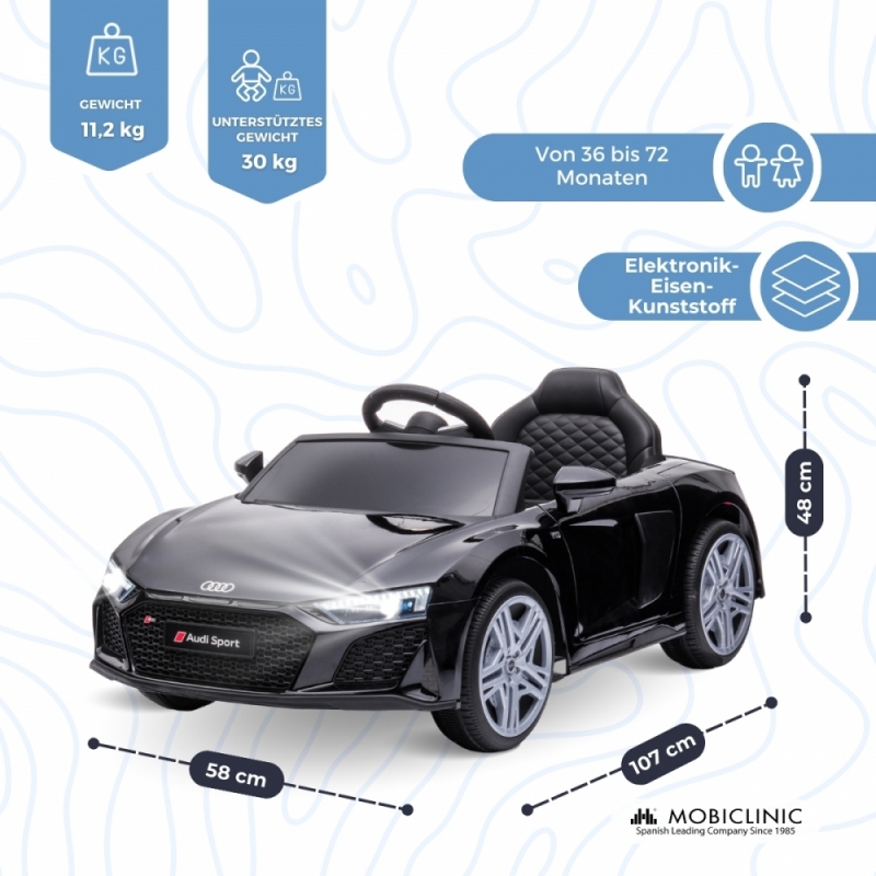 Das Elektroauto MobiSporty, lizenzierter Audi R8 Spyder, soll den Kleinen ein authentisches und sicheres Fahrerlebnis bieten. Mit Abmessungen von 107 cm Länge, 58 cm Breite und 48 cm Höhe ist dieses Elektroauto perfekt für Kinder zwischen 36 und 72 Monaten und bietet eine unterhaltsame und lehrreiche Möglichkeit, motorische Fähigkeiten und Koordination zu entwickeln.