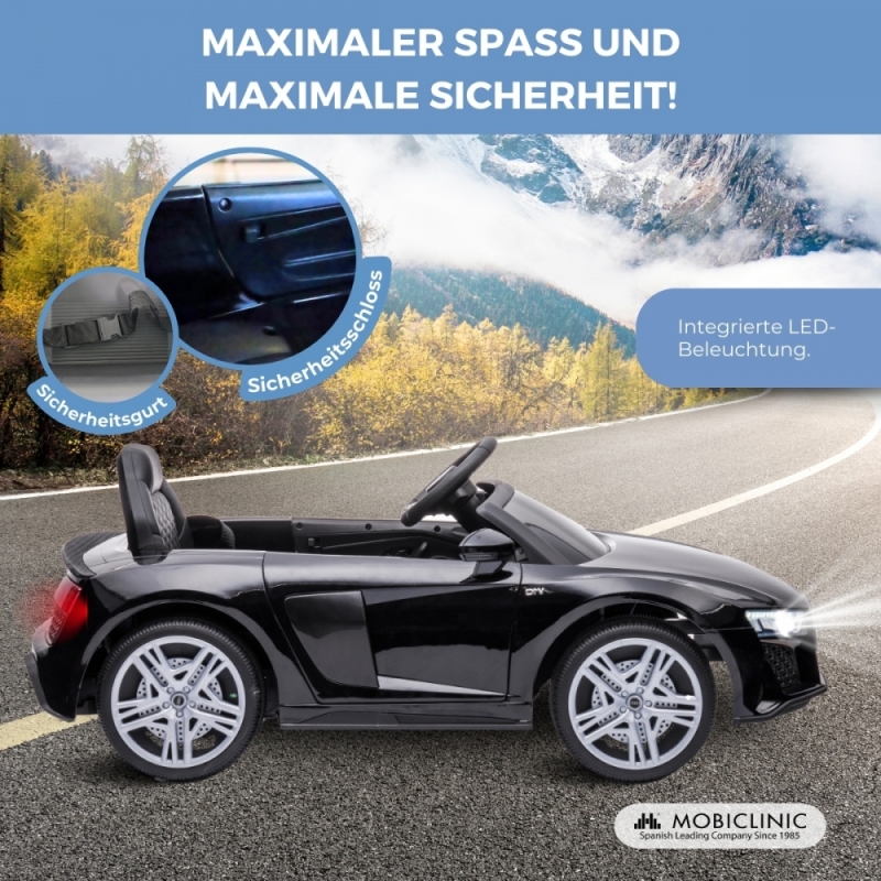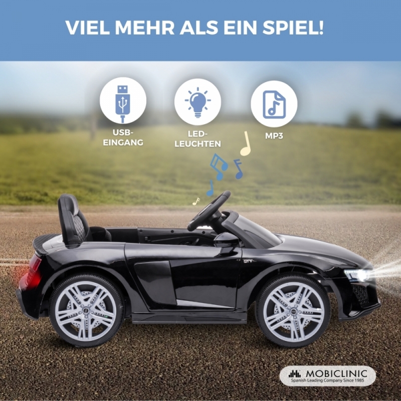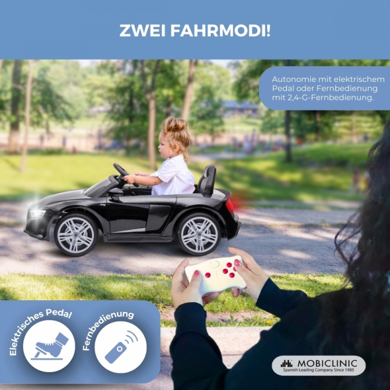 Das Elektroauto MobiSporty, lizenzierter Audi R8 Spyder, bietet ein realistisches und sicheres Fahrerlebnis für Kinder von 36 bis 72 Monaten. Dieses Fahrzeug eignet sich ideal für den Innen- und Außenbereich und ist mit einem elektrischen Pedal, einer 2,4-G-Fernbedienung, LED-Leuchten und Bluetooth-Funktionen ausgestattet.