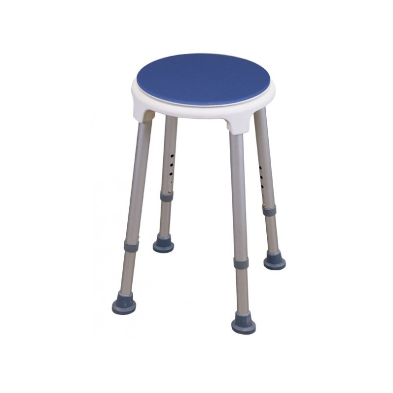 Runder blauer Sitzhocker. Aus Aluminium und Kunststoff, mit drehbarem Sitz für einfaches Umsetzen. Es ist komplett rostfrei und sehr leicht. Es hat 4 verstellbare Beine mit rutschfesten Spitzen. Der Sitz verfügt über eine weiche Polsterung, die sich weich anfühlt, um guten Komfort zu bieten.