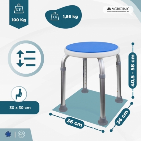 Der Duschhocker Foco sorgt für Sicherheit, Autonomie und Komfort im Badezimmer. Sein verstellbarer Knopf ermöglicht eine schnelle, werkzeuglose Einstellung auf acht Höhen von 40 bis 57,5 cm. Dieser Verstellbereich ermöglicht eine individuelle Sitzposition und ermöglicht so eine komfortablere, auf den Benutzer zugeschnittene Hygiene.