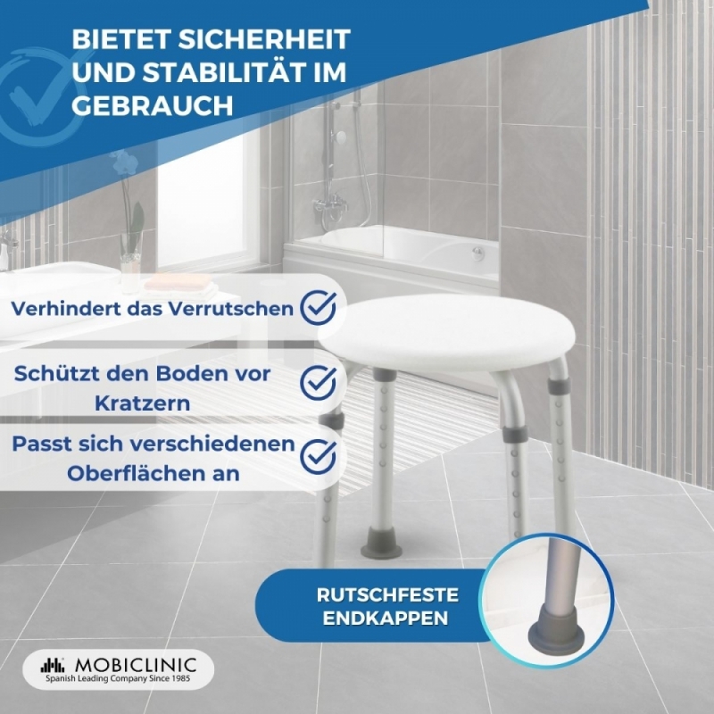 Es ist in der Höhe in 10 cm unabhängig von jedem Bein verstellbar. Die Beine vom Badestuhl haben Saugnäpfen mit hoher Anhaften, um eine größere Stabilität zu gewährleisten.