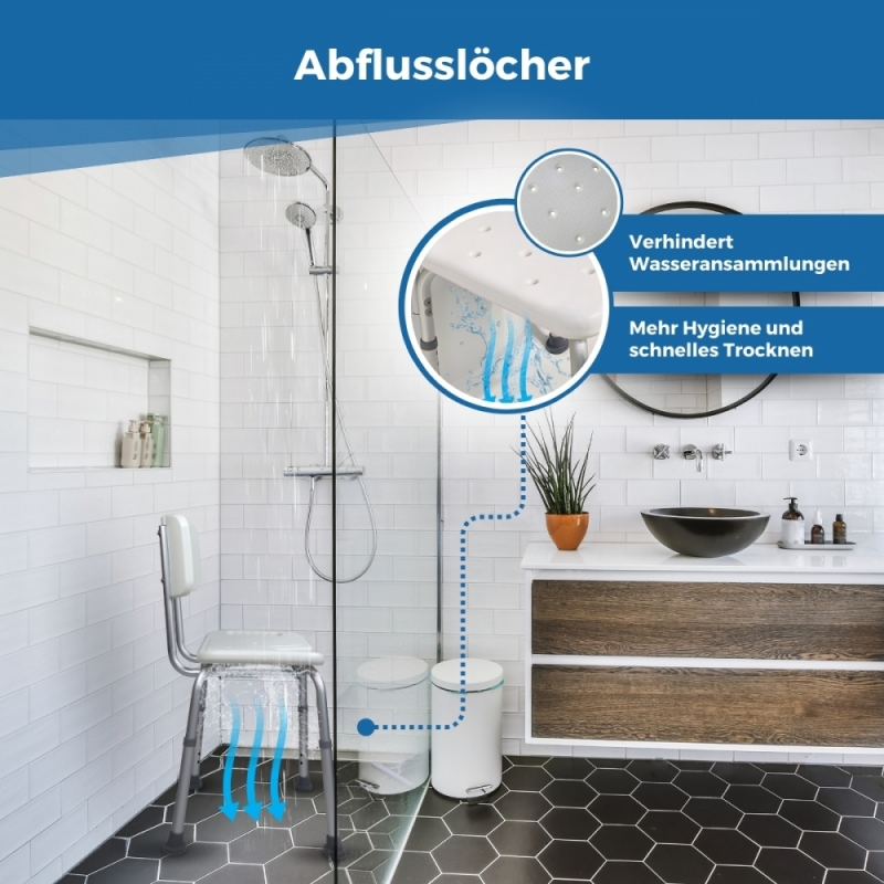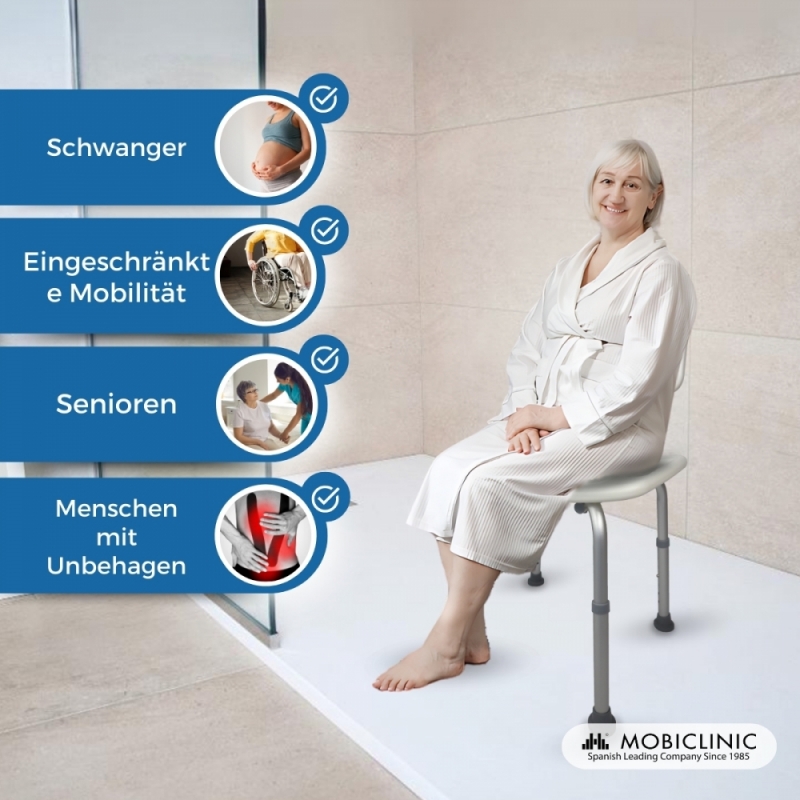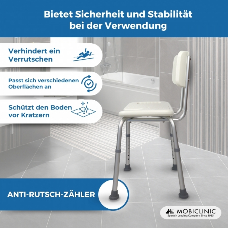 Er ist ideal für den Einsatz in der Dusche, der Badewanne oder jedem anderen Badezimmer. Das Design der Beine und die rutschfesten Gummispitzen sorgen für eine perfekte Anpassung an die Unterlage und garantieren so die Stabilität während der Benutzung.