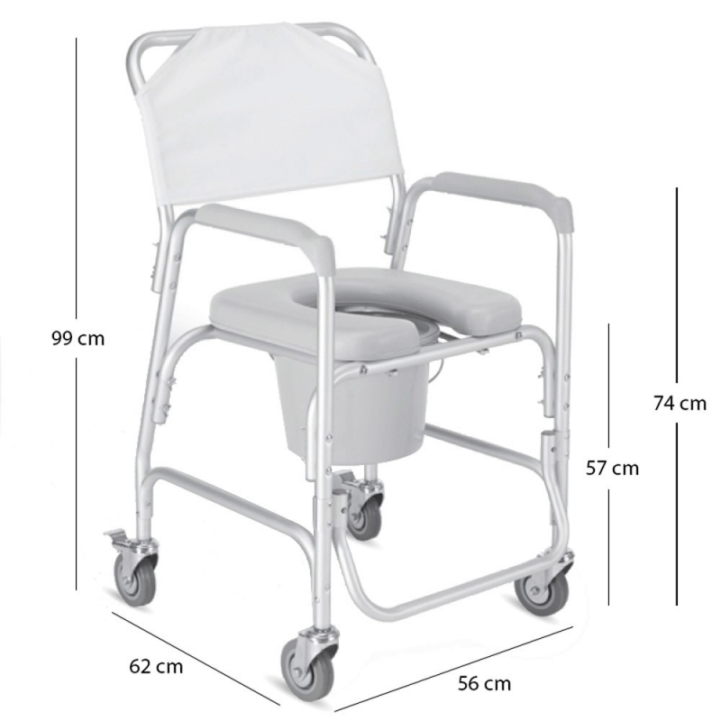 Die mobile Stuhlbadewanne und Innentoilette ist ein Rollstuhl, der den Transport der Person in die Dusche erleichtert. Darüber hinaus kann die Toilette auch im Innenbereich verwendet werden. Andererseits hat er Armlehnen, eine Rückenlehne und einen U-förmig gepolsterten Sitz, was den Komfort und die Hygiene erhöht.