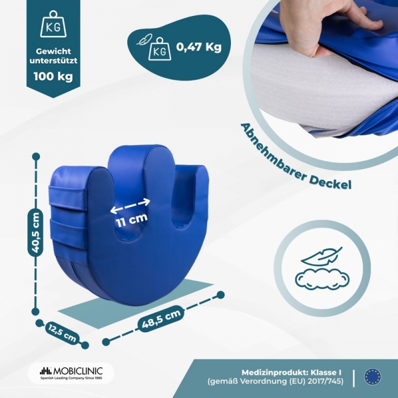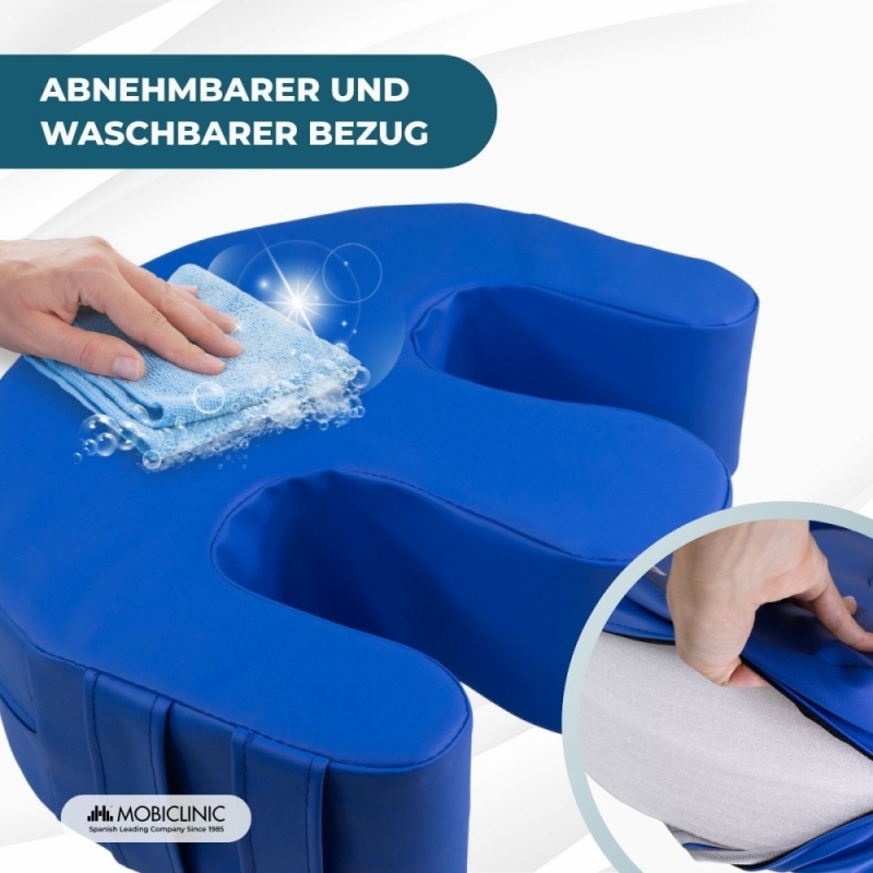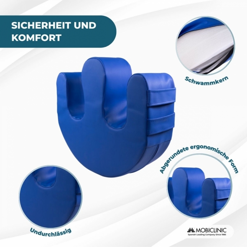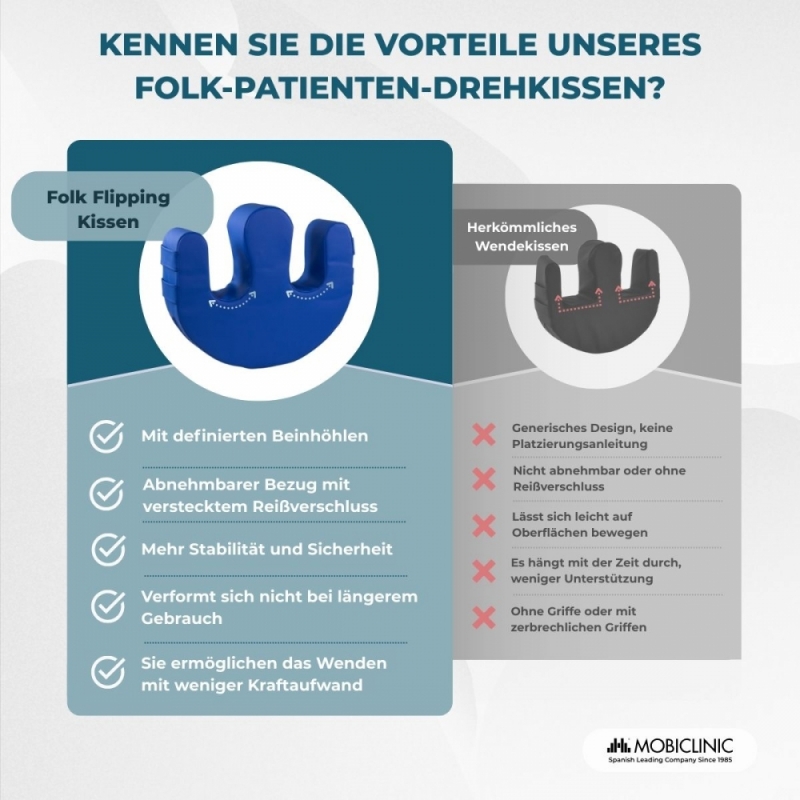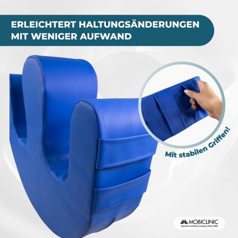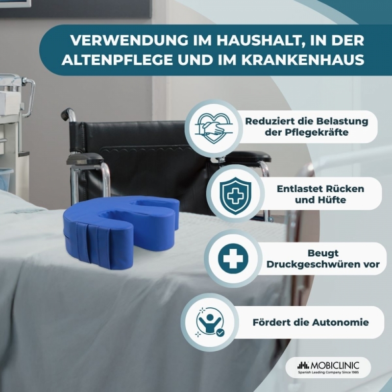 Das Mobiclinic® Folk Wendekissen wurde entwickelt, um die Pflege bettlägeriger Patienten zu verbessern und Haltungsänderungen mit vollem Komfort und Sicherheit zu ermöglichen. Seine U-Form mit abgerundetem Beinspreizer und zwei ergonomischen Seitengriffen ermöglicht dem Pflegepersonal eine mühelose Umlagerung des Patienten, reduziert die körperliche Belastung und verbessert die Effektivität der täglichen Pflege.