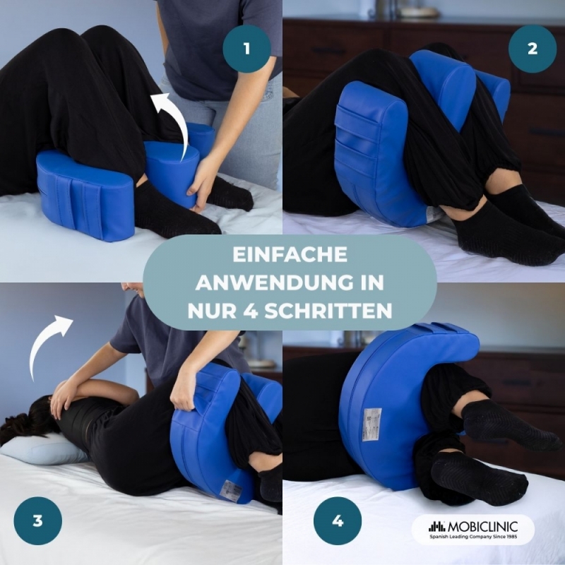 Die Anwendung des Folk-Kissens ist intuitiv : Schieben Sie die Beine des Patienten einfach durch die Aussparungen im Kissen, legen Sie eine Hand auf seine Taille oder seinen Rücken und halten Sie mit der anderen einen der seitlichen Griffe fest, um das Kissen leicht zu wenden. Dank des geringen Gewichts und der kompakten Größe kann dieser Vorgang zu Hause, in Pflegeeinrichtungen oder auf Reisen durchgeführt werden.
