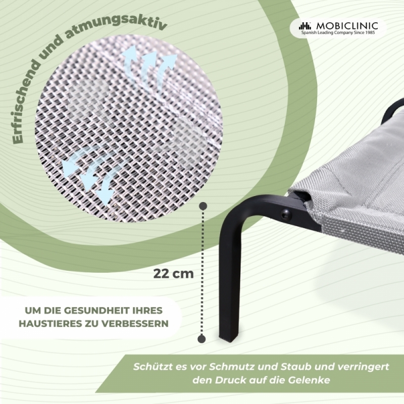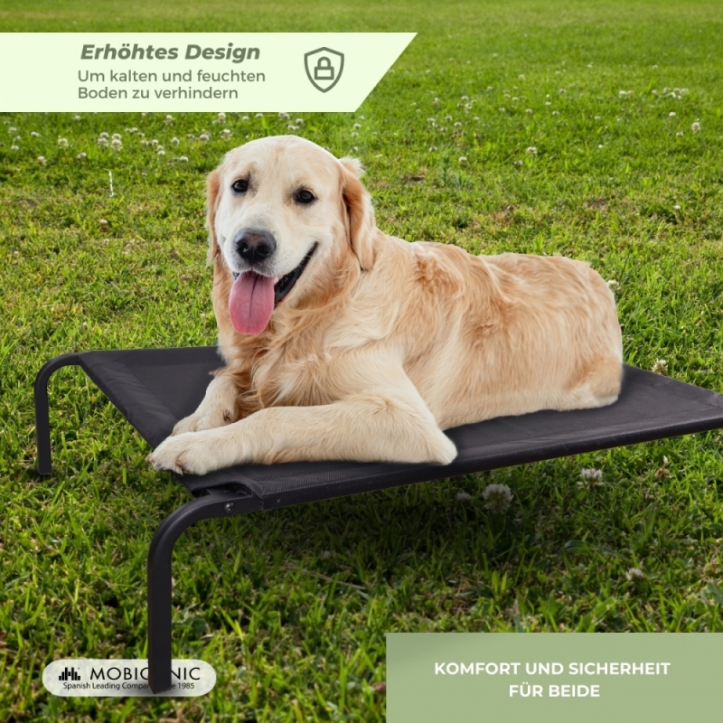 Das erhöhte Hundebett ist eine kühlende und isolierende Option für die heißesten Sommertage, da es Ihr Haustier vom Boden fernhält und die Luft freier in alle Richtungen strömen lässt. So kann sich Ihr Hund nach einem langen Spaziergang ausruhen und wird nicht auf dem Boden schmutzig oder friert im nassen Zustand.