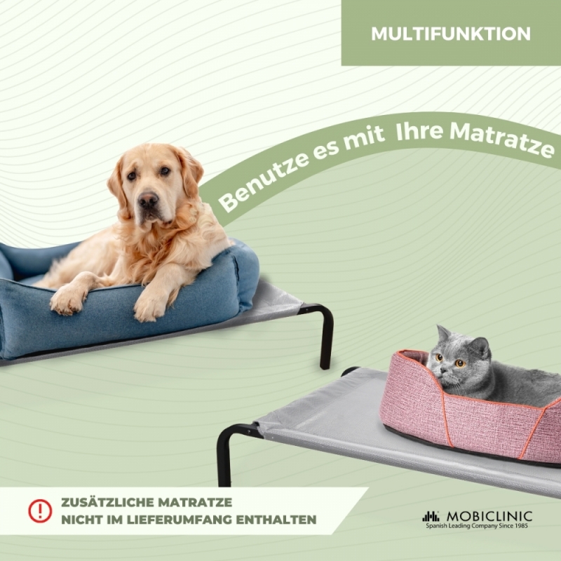 Dieses hohe Haustierbett ist ideal für den Innen- und Außenbereich. Aufgrund seines geringen Gewichts und seiner Größe können Sie ihn problemlos mit ins Wohnzimmer oder in den Garten nehmen, sodass Ihr Hund immer und überall neben Ihnen ruhen kann. Dank des einfachen und intuitiven Designs können Sie es in nur wenigen Minuten und ohne Werkzeug zusammenbauen.