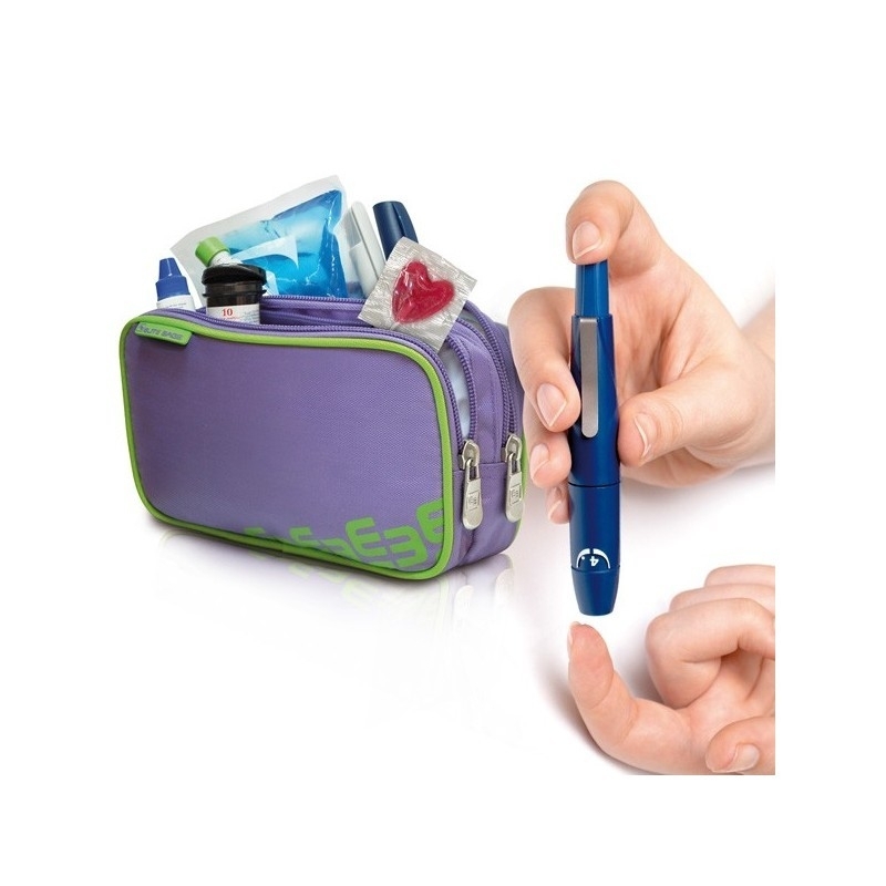 Auf der Vorderseite befindet sich eine Tasche, die für den Transport vom Diabetes Diagnosematerial wie: Blutzuckermessgerät, Lanzetten, Teststreifen, usw. dient. Die Rückseite der Tasche ist sowohl für das Kühlgel, als auch die Insulin-Applikatoren gedacht und gewährleistet die richtige Temperatur, auch im Sommer.