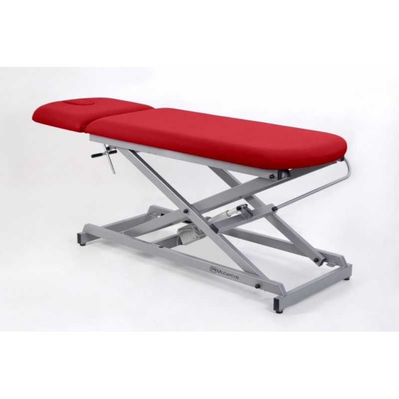 2-teilige elektrische Untersuchungsliege mit positiv/negativ verstellbarer Rückenlehne, Rollenhalter und Gesichtsloch.