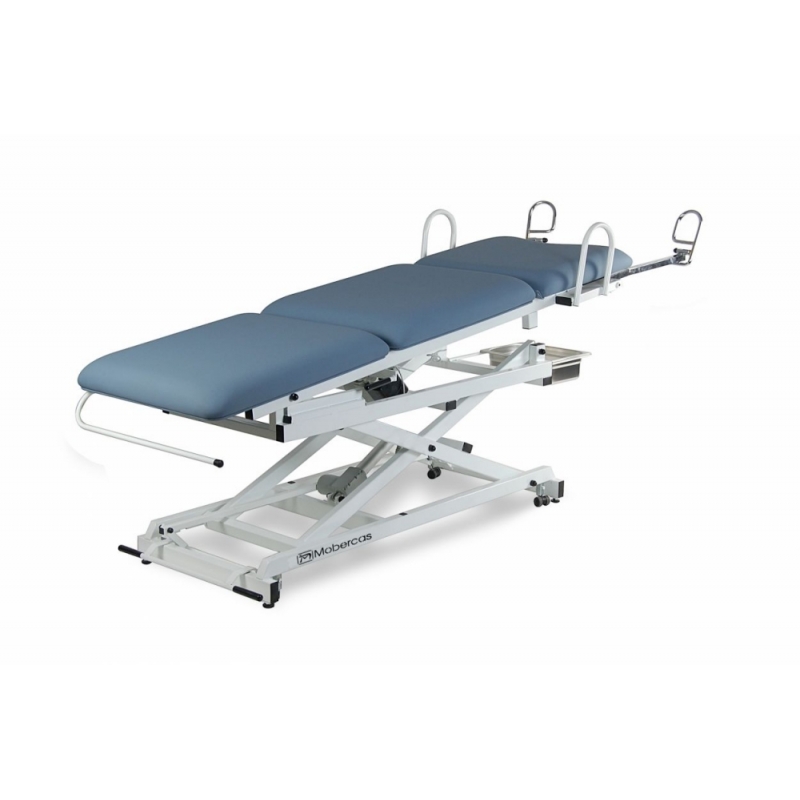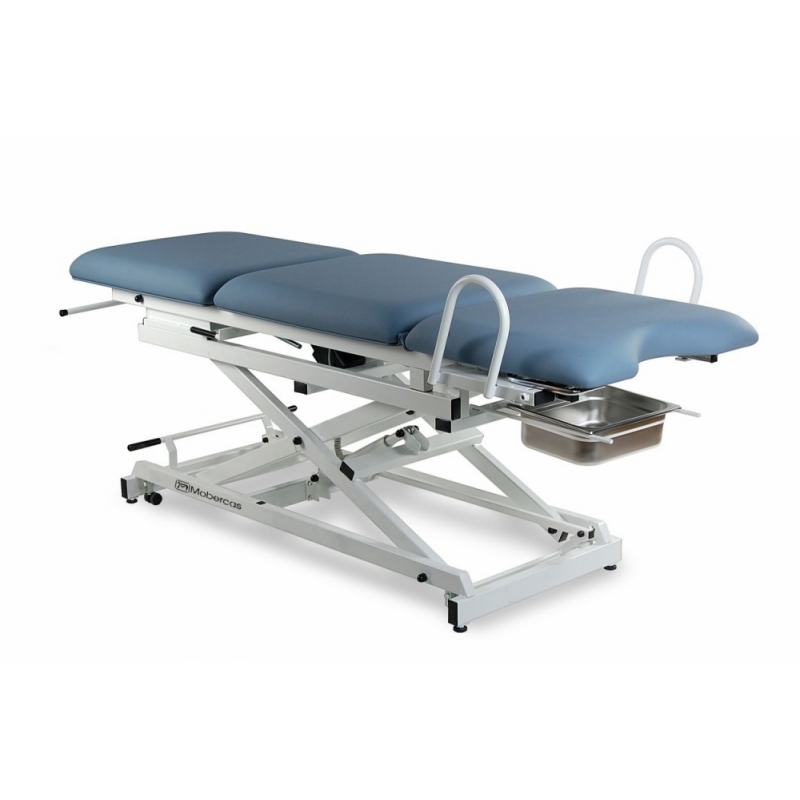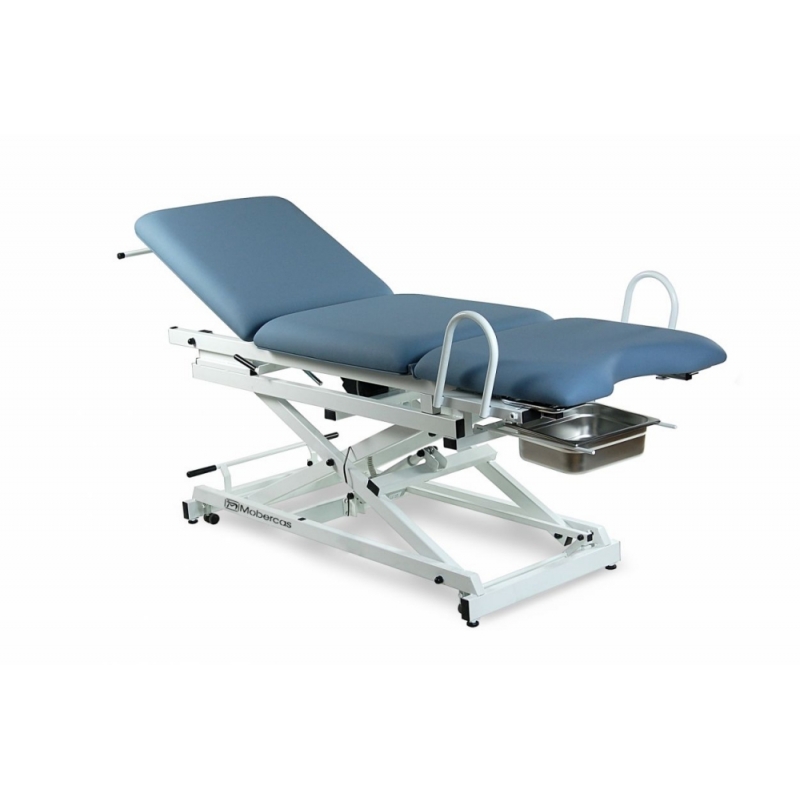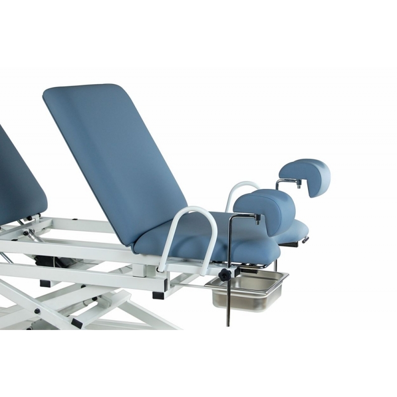 3-motorige elektrische gynäkologische Untersuchungsliege zur Höhen-, Rückenlehnen- und Trendelenburg-Verstellung per Handschalter. Scherentragwerk mit geradem Anstieg ohne seitliche Verschiebung.