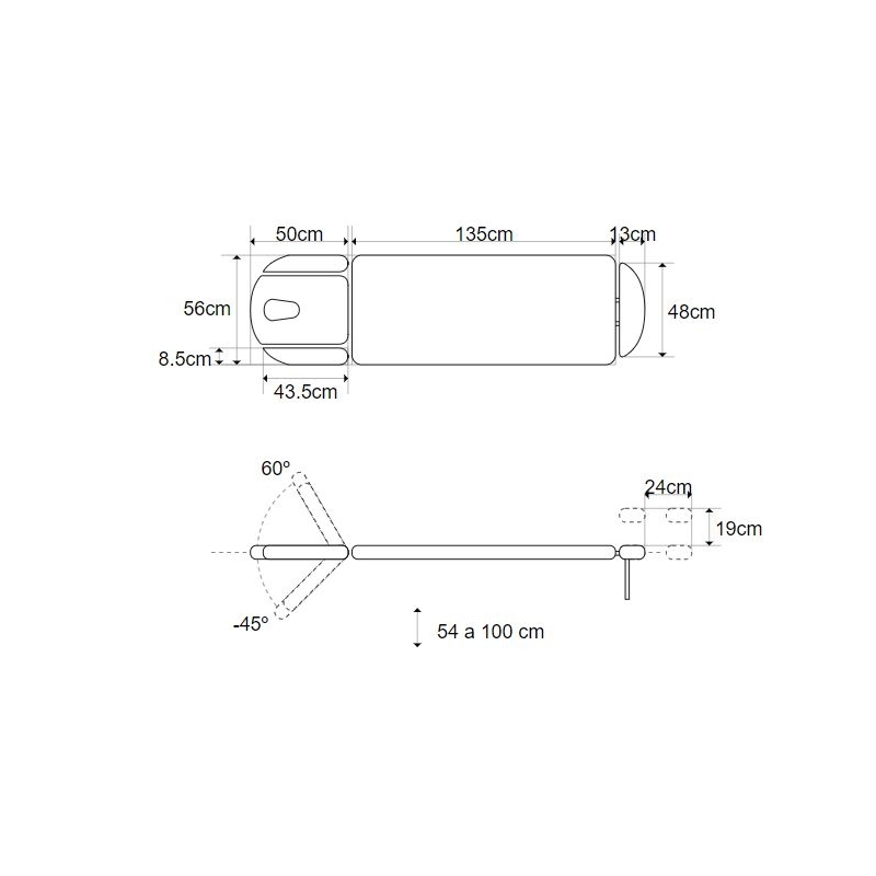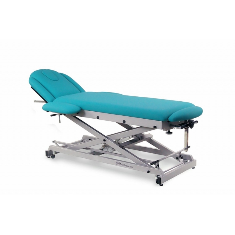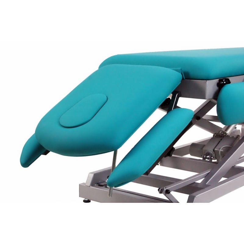 Multifunktionelle elektrische Osteopathie-Liege mit 7 Zonen, mit geradem Anstieg, ohne seitliche Verschiebung, Kopfteil inkl. Ausschnitt und einziehbaren Rollen. Negative, verstellbare Rückenlehne mit Armlehnen, seitliche Armlehnen und verstellbare und abnehmbare Fußstütze.