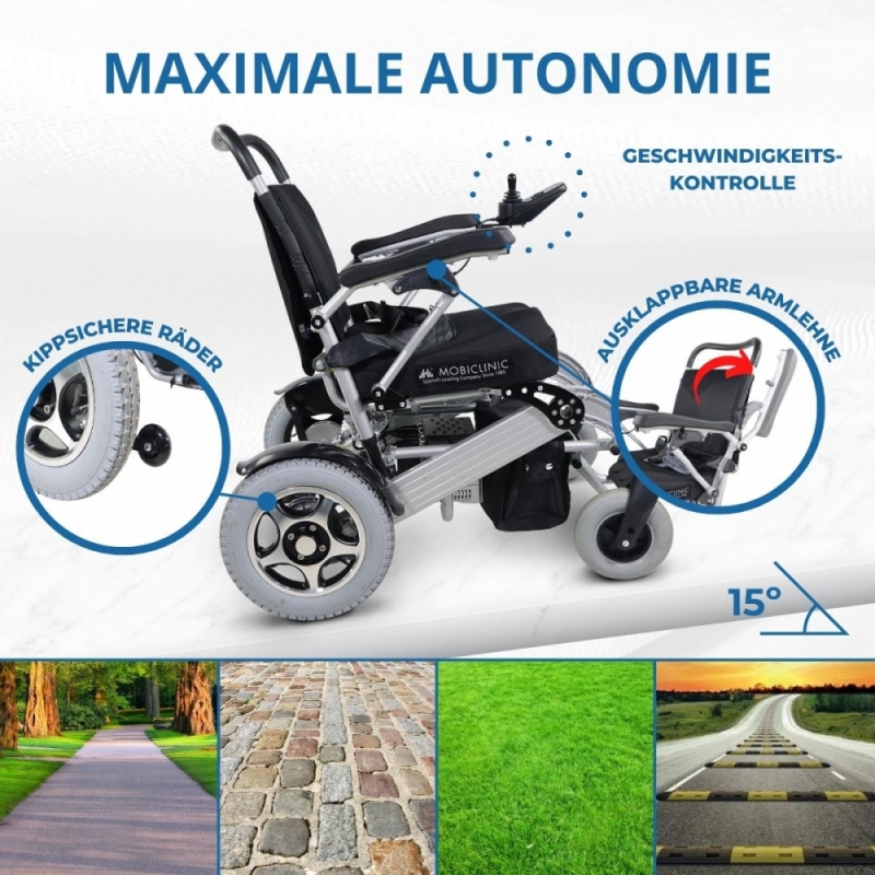 Der Elektrorollstuhl Troya Plus von Mobiclinic wurde entwickelt, um dem Benutzer Komfort und Mobilität auf jedem Gelände zu garantieren. Dank seines Gewichts von nur 24,8 kg und seines praktischen Vorwärtsklappsystems können Sie diesen Stuhl in jedem Kofferraum transportieren und überall dort einsetzen, wo Sie ihn brauchen. Und wenn Sie ihn nicht benutzen, können Sie den Klappstuhl problemlos überall in Ihrem Zuhause verstauen.