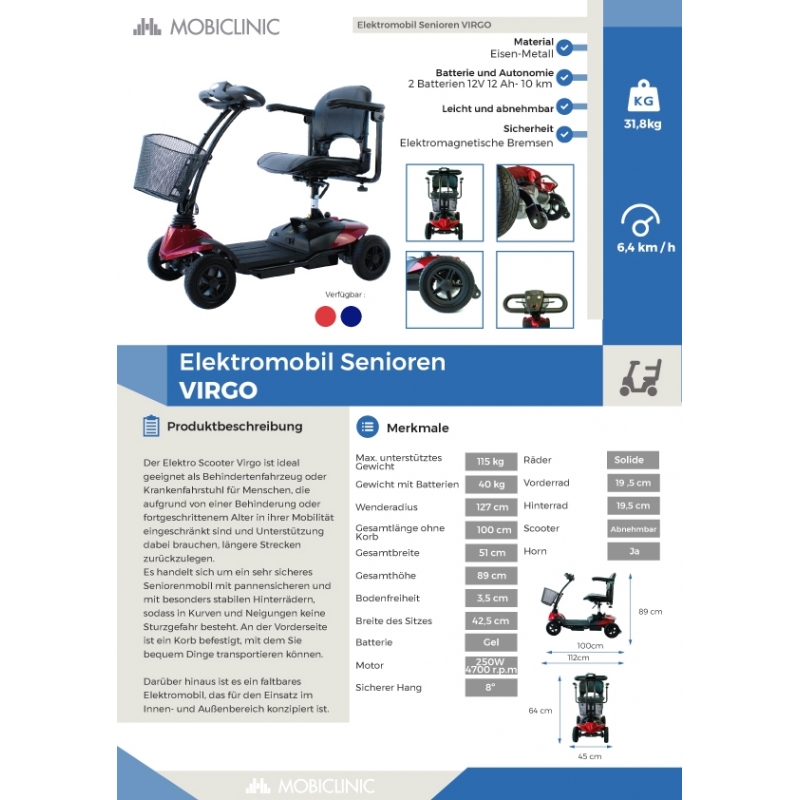 Das Elektromobil Senioren Virgo für Erwachsene hilft bei der Lösung von Mobilitätsproblemen für Menschen, die aufgrund einer Behinderung Schwierigkeiten mit der Mobilität haben, nicht lange und/oder weite Strecken gehen können oder aufgrund ihres Alters leicht ermüden.