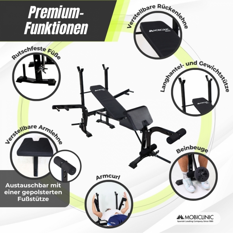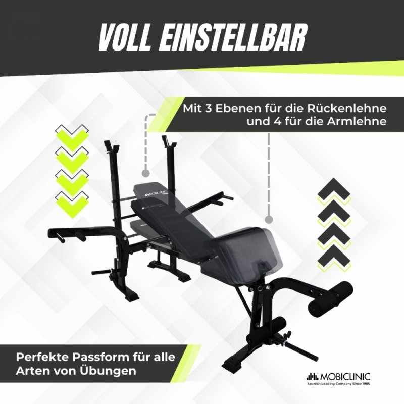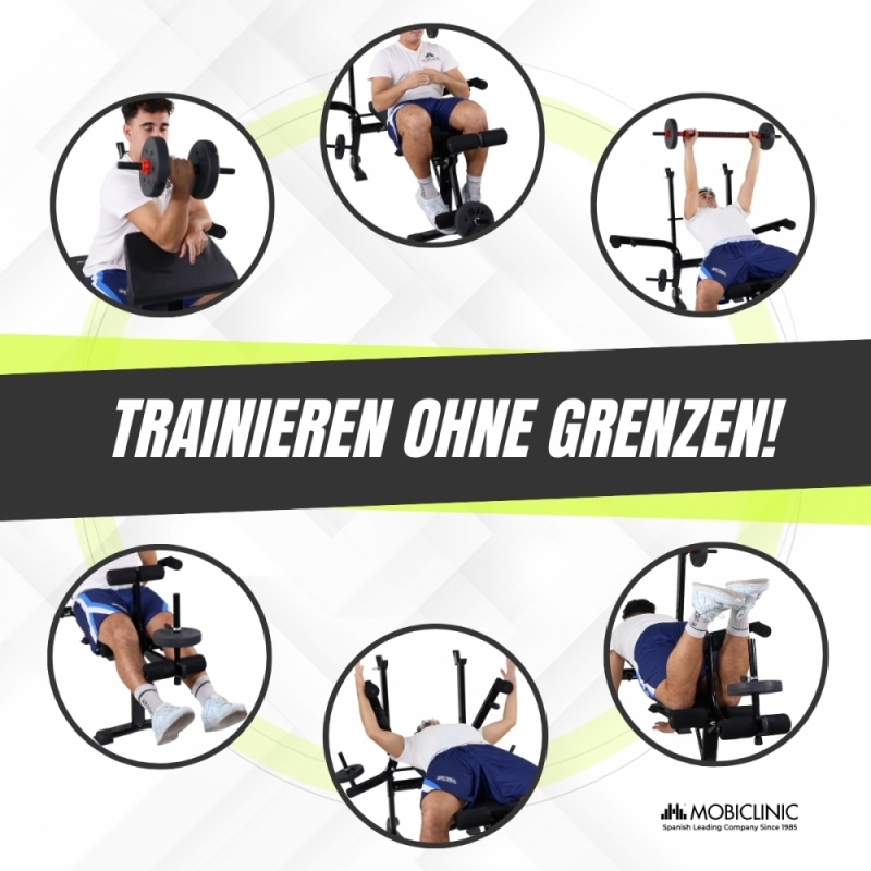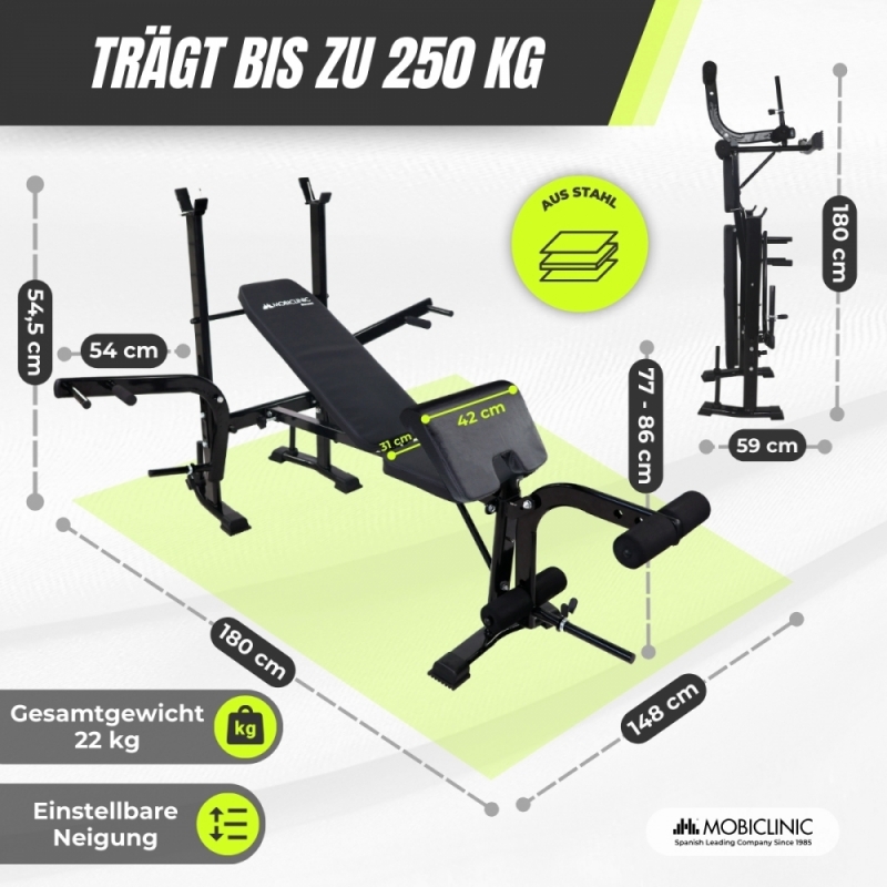 Multifunktions-Hantelbank | klappbar | verstellbar | Stangenauflage | 148x180x110,5cm | 250kg | Pressfit | Mobiclinic