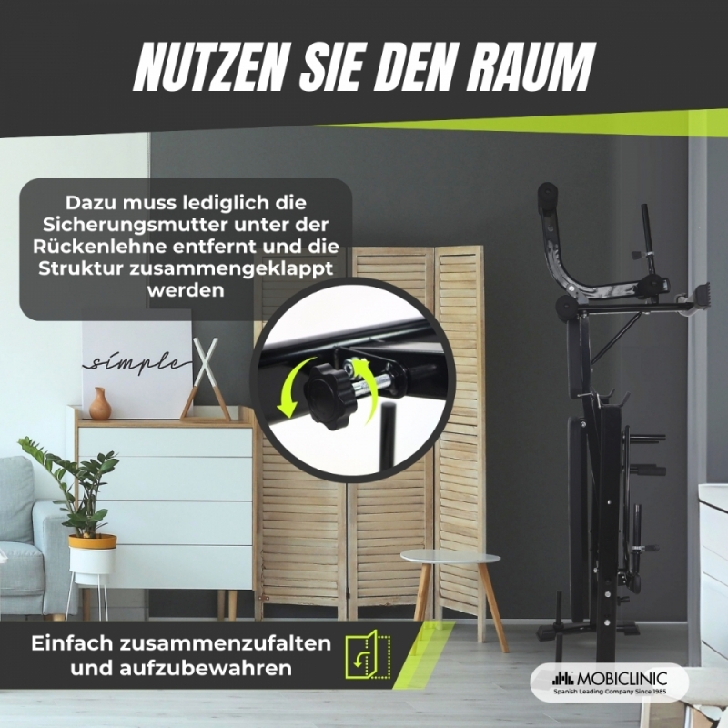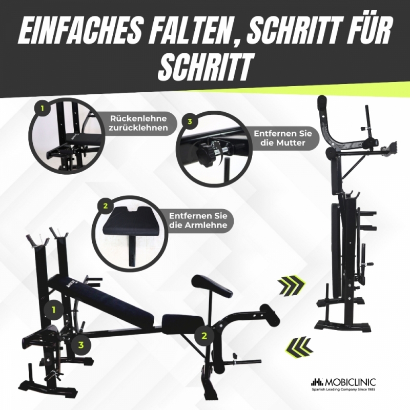 FALTBAR UND EINFACH ZU LAGERN : Diese Bank ist leicht zusammenklappbar und ermöglicht eine praktische Aufbewahrung in jeder Ecke des Hauses. Trotz seiner robusten Struktur und der maximalen Tragfähigkeit von 250 kg lässt es sich leicht bewegen und passt sich jedem Raum an, ohne die Qualität des Trainings zu beeinträchtigen.