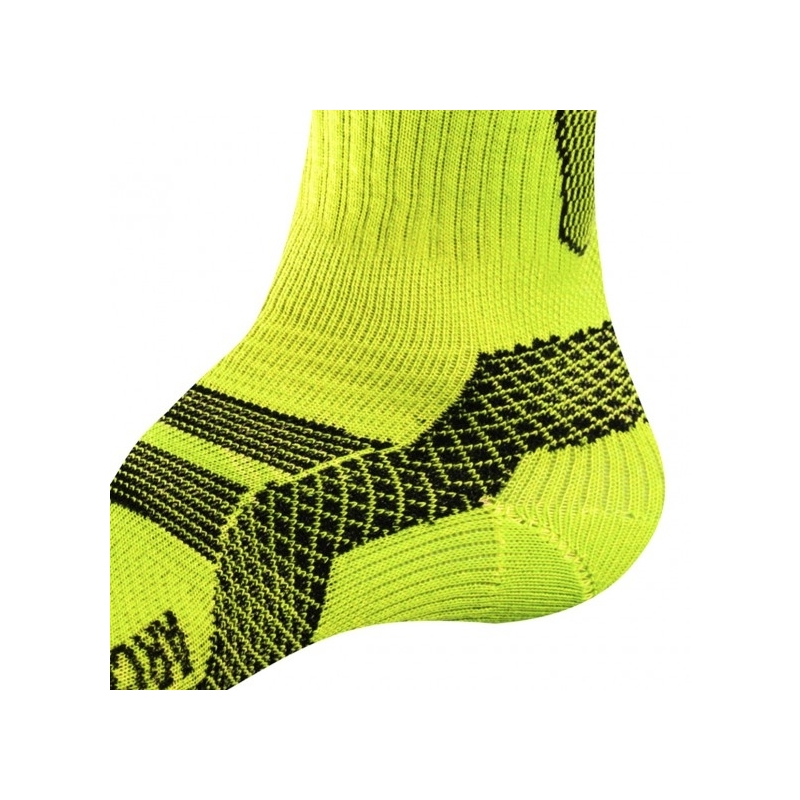 Technisches Hochleistungsgewebe. Sanfte und angenehme Empfindungen. Der Körper produziert Wärme und damit Feuchtigkeit. Das Material der Socken ist so konzipiert, dass die Luft zwischen der Haut und dem Stoff zirkulieren kann, die Feuchtigkeit abtransportiert wird, die Wärme gespeichert wird und die Haut kühl und trocken bleibt.