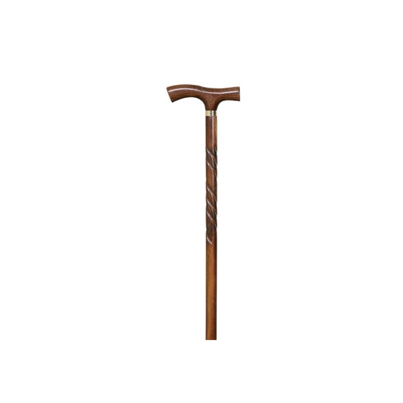 Diese braune Krücke ist aus Buchenholz gefertigt, der Griff ist an einem silberfarbenen Ring befestigt. Der Gehstock verfügt über in das Holz schön geschnitzte Details.