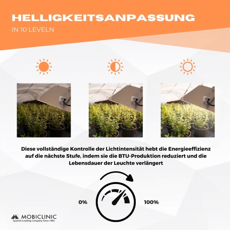 In puncto Energieeffizienz bietet das Growlight Pflanzenlicht 10 einstellbare Helligkeitsstufen (10 %, 20 %, 30 %, 40 %, 50 %, 60 %, 70 %, 80 %, 90 % und 100 %). Dadurch können Sie die für Ihre Pflanzen am besten geeignete Stufe auswählen und die Intensität des Vollspektrumlichts anpassen, das 660 nm rotes Licht, 730 nm Infrarotlicht und 460 nm blaues Licht umfasst. Diese vollständige Kontrolle der Lichtintensität hebt die Energieeffizienz auf die nächste Stufe, reduziert die BTU-Leistung und verlängert die Lebensdauer der Leuchte.