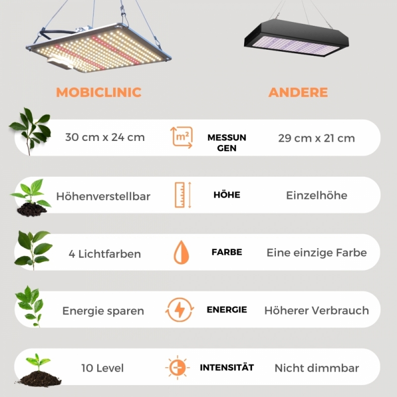 Das Pflanzenlicht Growlight bietet nicht nur fortschrittliche Technologie, sondern kümmert sich auch um das Wohlbefinden Ihrer Pflanzen. Es passt sich Ihren spezifischen Bedürfnissen an, steigert die Photosynthese und sorgt für eine optimale Gesundheit. Benutzer haben von einer beeindruckenden Ertragssteigerung von 38 % nach der Umstellung auf unser Wachstumslicht berichtet. Mit einer hervorragenden Lichtleistung von bis zu 2,8 mol/J sind Ihre Pflanzen in den besten Händen.