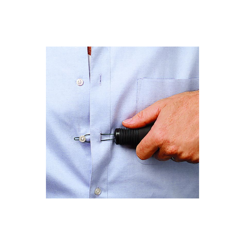 Es besteht aus einem Edelstahldraht und einem anatomischen Griff, der für eine bessere Ergonomie des Benutzers vorbereitet ist. Um es zu verwenden, führen Sie den Draht durch das Knopfloch Ihres Kleidungsstücks und nehmen Sie den Knopf, indem Sie ihn in das Knopfloch bewegen.