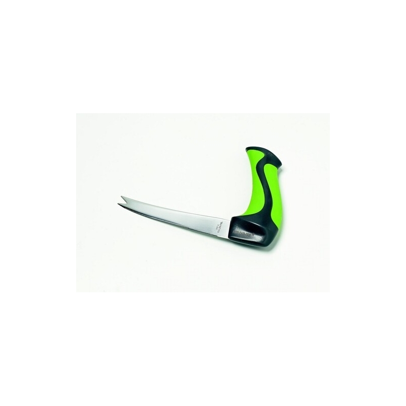 Este cuchillo tenedor tiene un mango ergonómico en forma de L, inspirado directamente en los cuchillos de carnicero, que limita el esfuerzo de corte o uso. El mango ergonómico está hecho de material antideslizante para que no resbale durante la preparación.