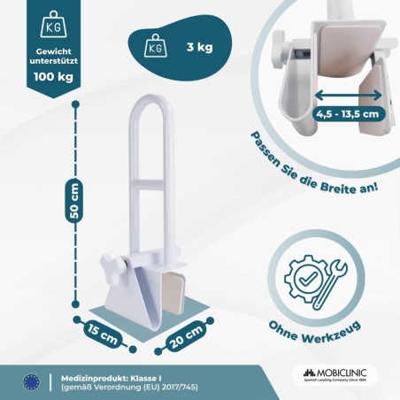 Es passt auf Badewannen mit glatten, flachen Kanten und einer Breite von mindestens 4,5 cm bis maximal 13,5 cm und ist somit für verschiedene Badewannenmodelle geeignet. Der ergonomische Griff ermöglicht einen festen und sicheren Halt, auch mit nassen Händen. Es zeichnet sich vor allem durch seine robuste Konstruktion aus, ist bis zu 100 kg belastbar und eignet sich sowohl für den klinischen als auch für den privaten Gebrauch.