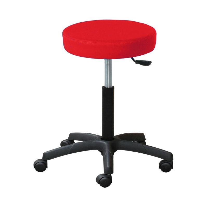 Dieser höhenverstellbarer drehbarer Hocker ist mit einem Sitz aus Skai von 33 cm Durchmesser ausgestattet. Es ist höhenverstellbar durch ein Schwarz-Chrom metalischen Gasdruckfeder. Die Basis ist schwarz oder Aluminium aus Plastik und mit 5 Rädern von 50 mm Durchmesser ausgestattet.