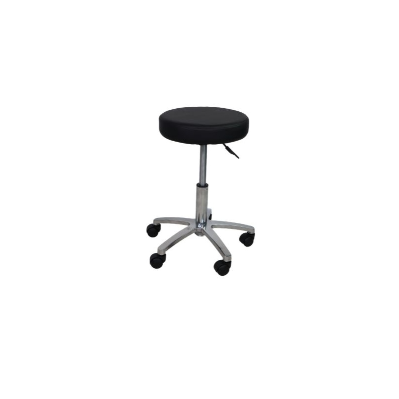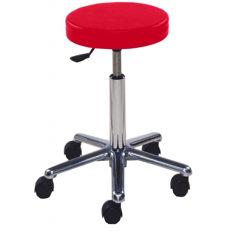 Dieser höhenverstellbarer drehbarer Hocker ist mit einem Sitz aus Skai von 33 cm Durchmesser ausgestattet. Es ist höhenverstellbar durch ein Schwarz-Chrom metalischen Gasdruckfeder. Die Basis ist schwarz oder Aluminium aus Plastik und mit 5 Rädern von 50 mm Durchmesser ausgestattet.